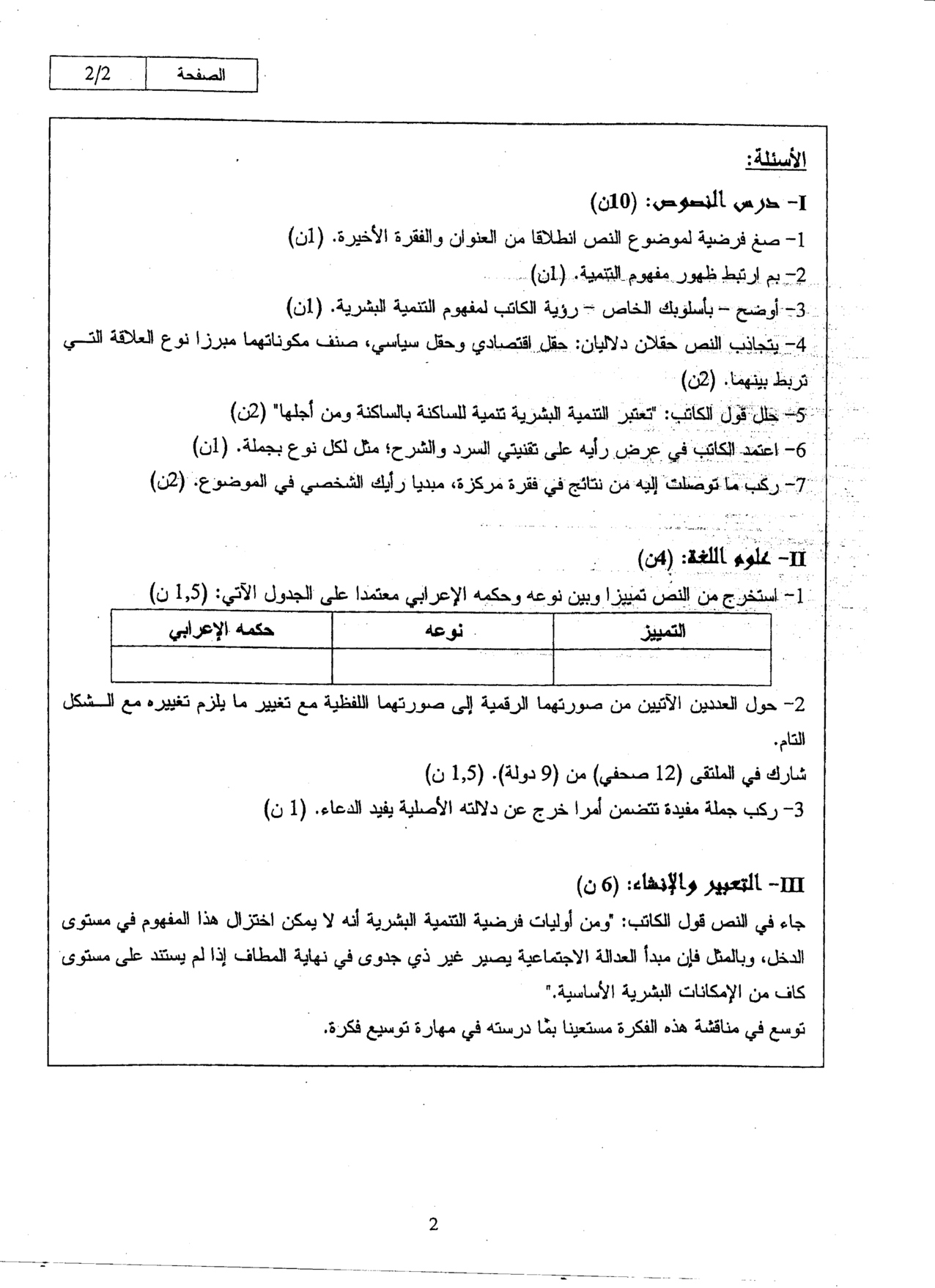 الفرض 2 نموذج 9 - اللغة العربية أولى باك الدورة الأولى