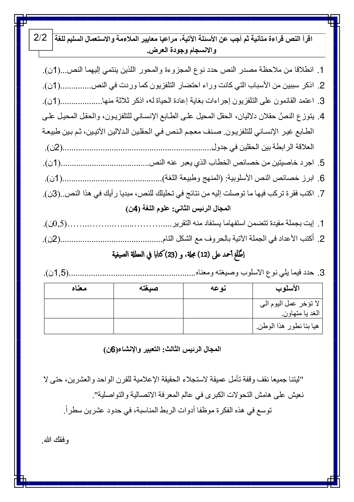 الفرض 2 نموذج 2 - اللغة العربية أولى باك الدورة الثانية