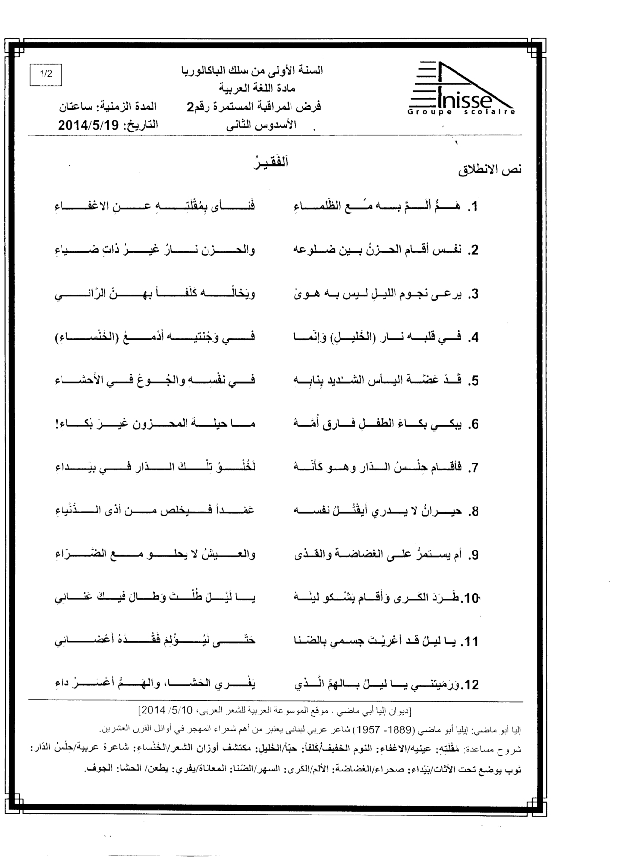 الفرض 2 نموذج 7 - اللغة العربية أولى باك الدورة الثانية
