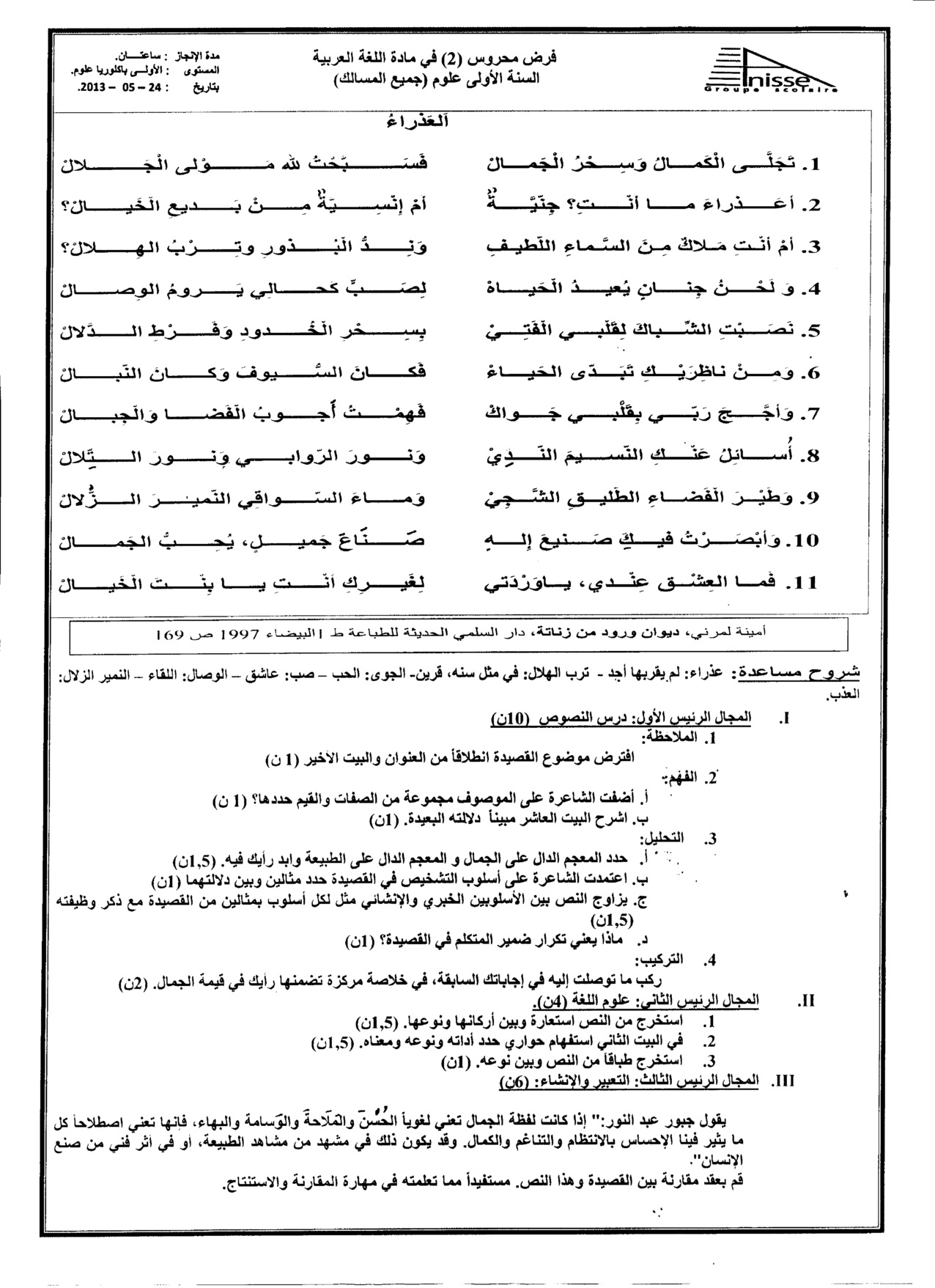 الفرض 2 نموذج 8 - اللغة العربية أولى باك الدورة الثانية