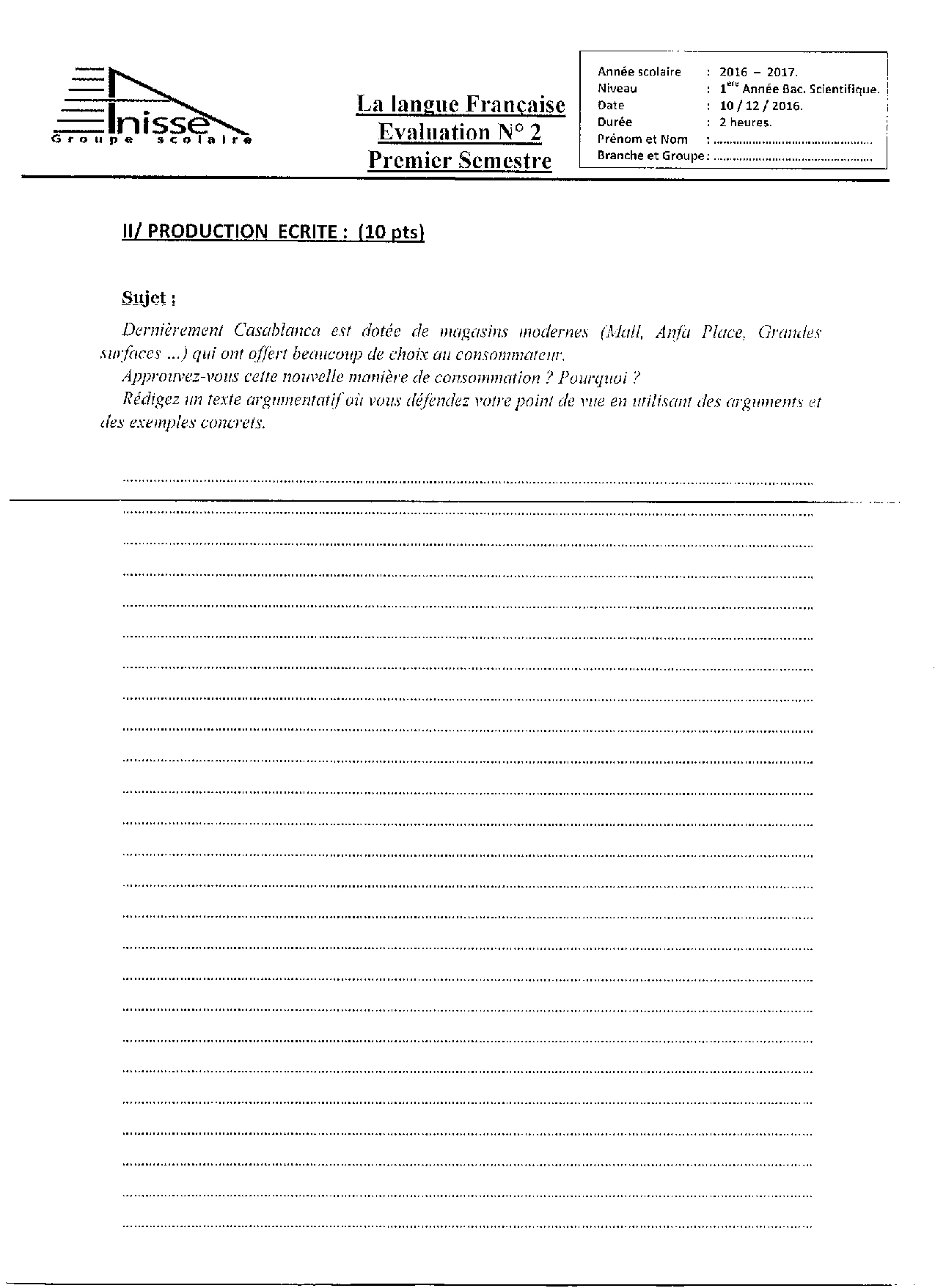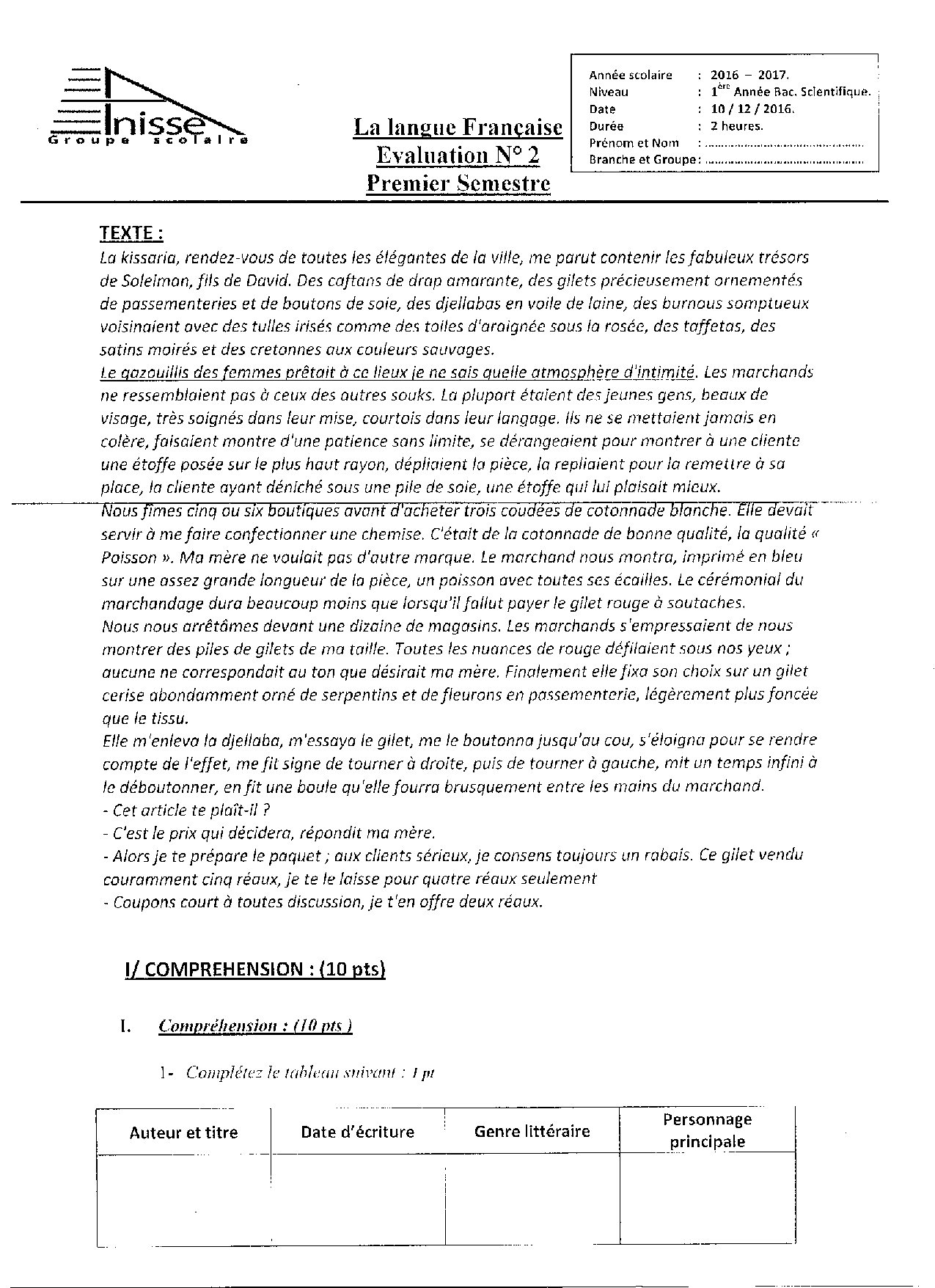 Français: 1er BAC Lettres et Sciences Humaines