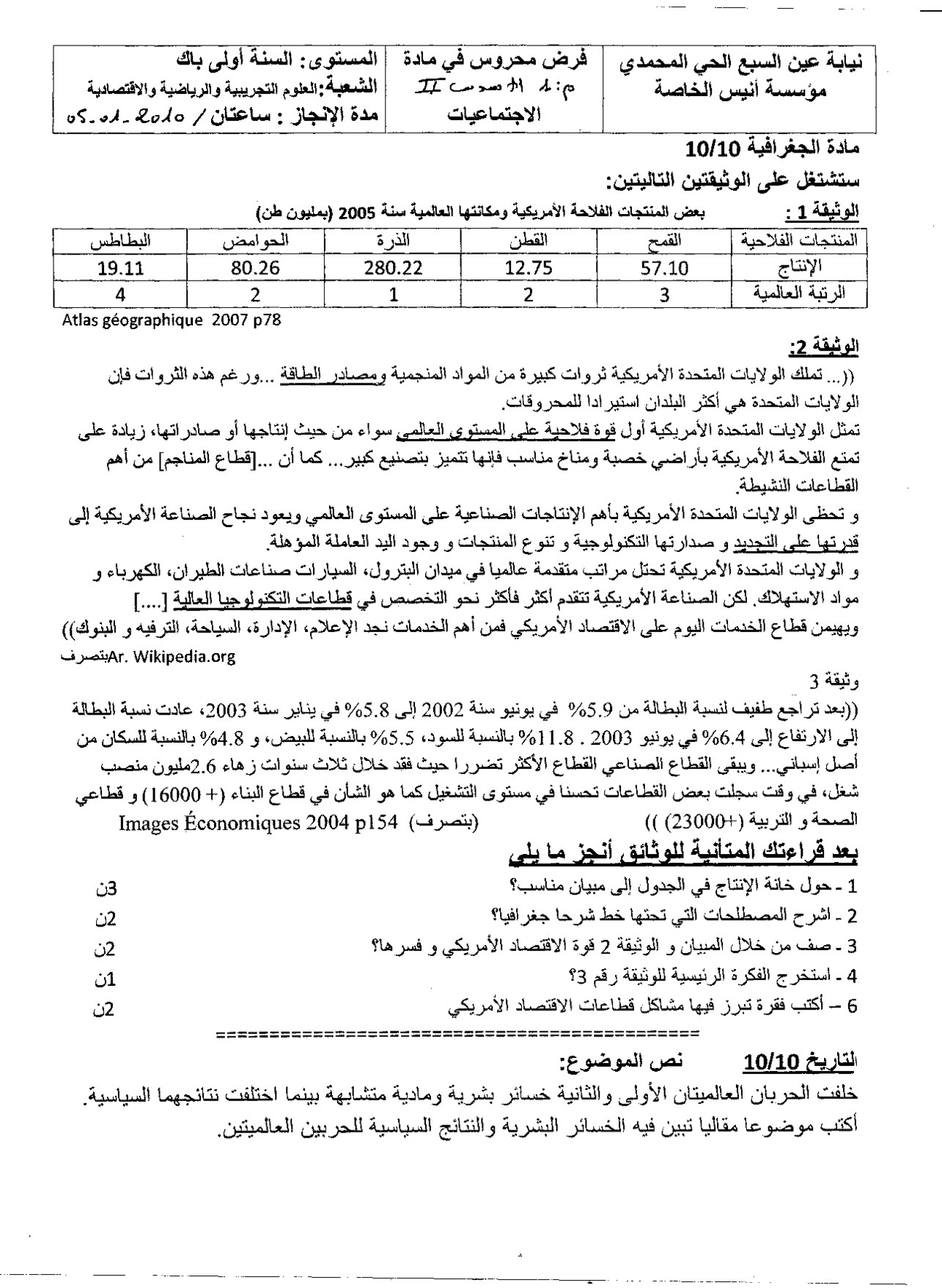 الفرض 1 نموذج 9 - الإجتماعيات أولى باك الدورة الثانية
