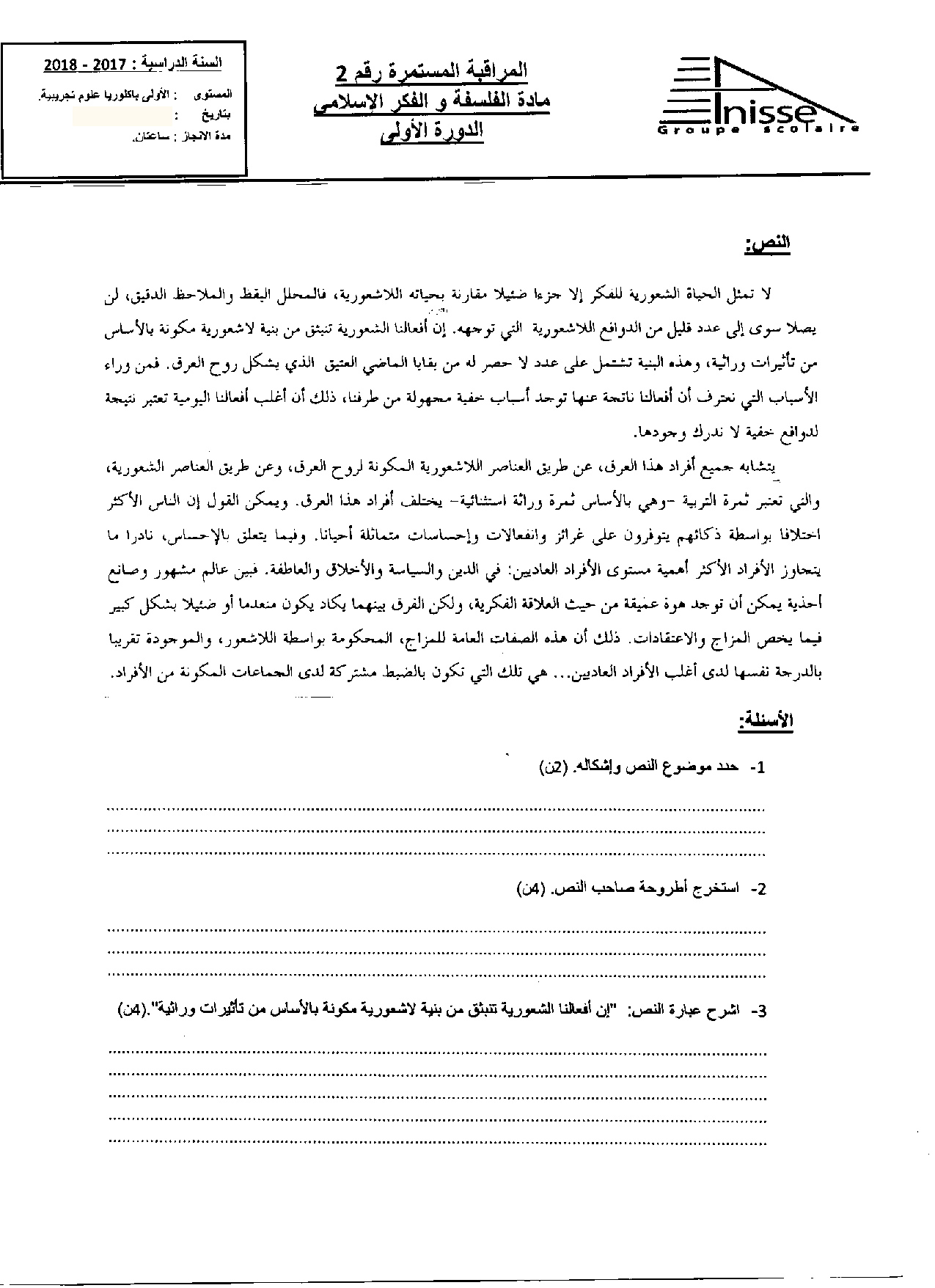 الفرض 2 نموذج 2 - الفلسفة أولى باك الدورة الأولى