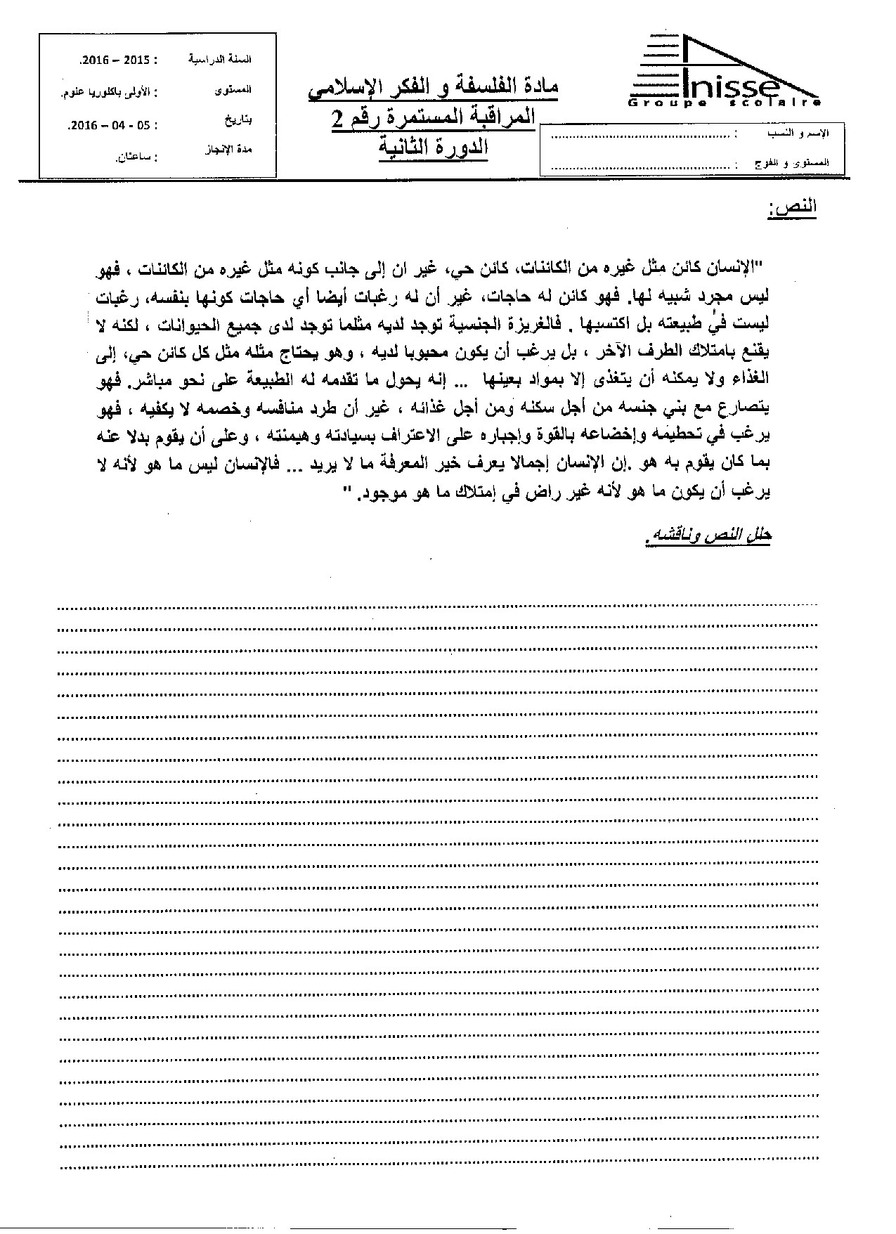 الفرض 2 نموذج 3 - الفلسفة أولى باك الدورة الثانية