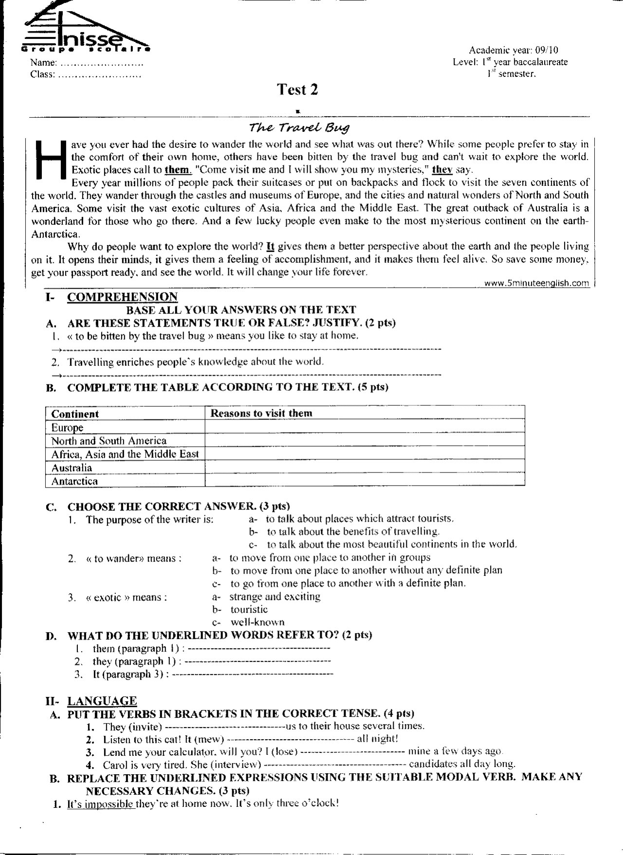 Test 2 Model 10 - English 1st Bac First term