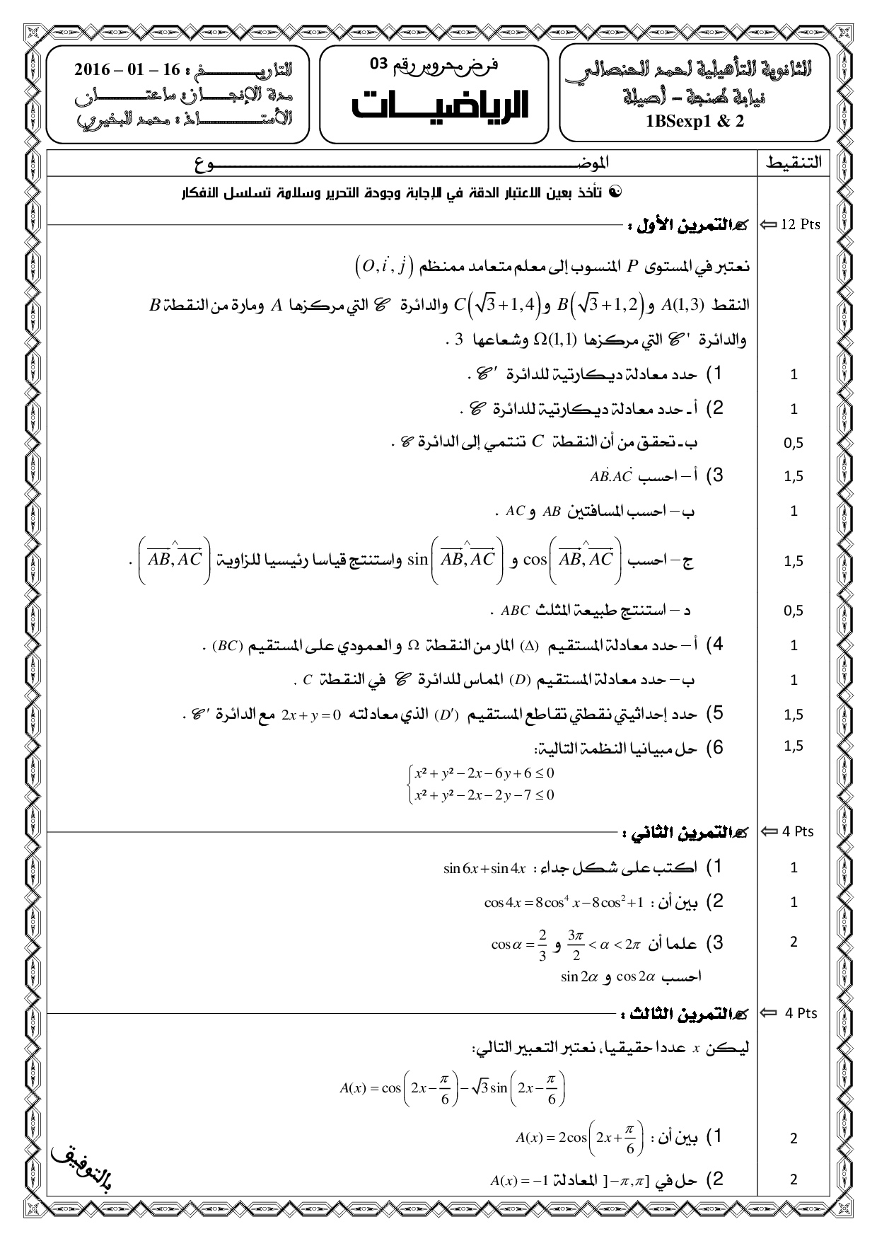 الفرض 3 نموذج 1 - الرياضيات أولى باك علوم تجريبية الدورة الأولى