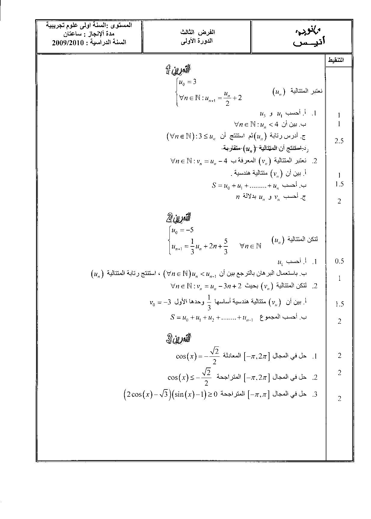 الفرض 3 نموذج 5 - الرياضيات أولى باك علوم تجريبية الدورة الأولى