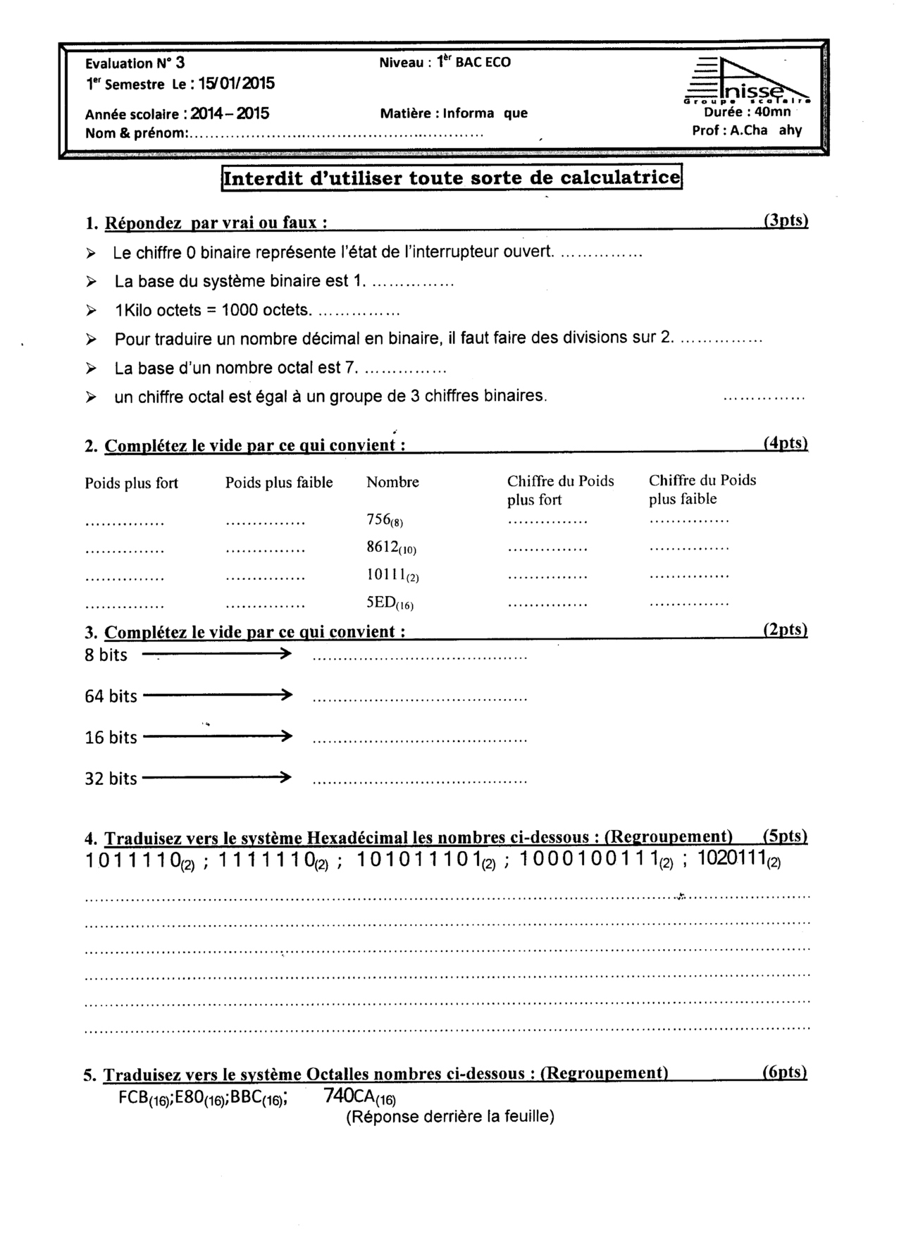 Devoir 2 Modèle 2 - Informatique de gestion 1 Bac Eco Semestre 1