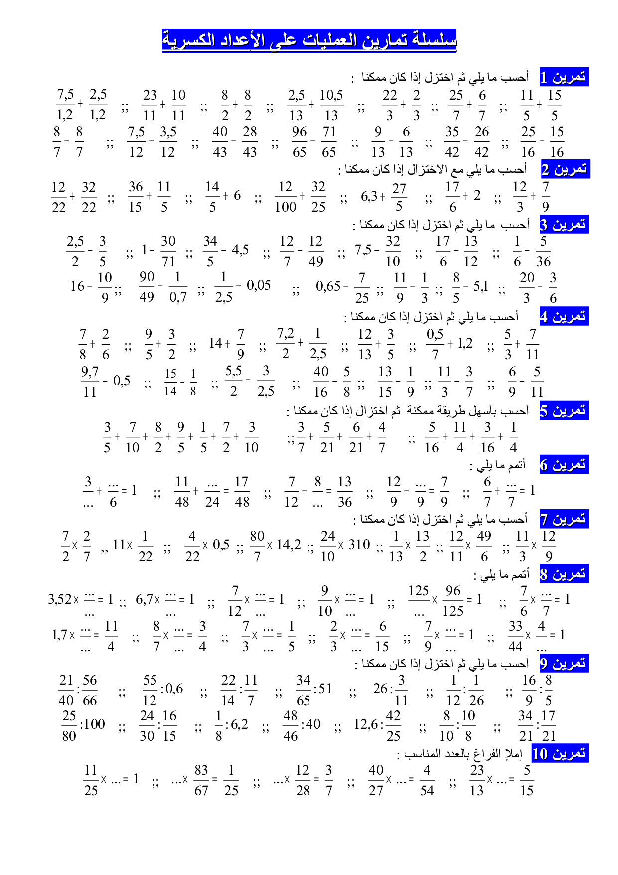 العمليات على الأعداد الكسرية - تمارين غير محلولة 1