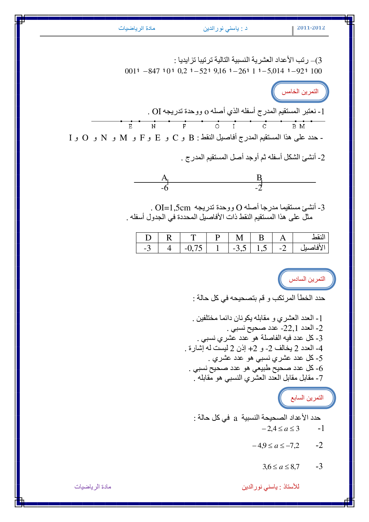 تقديم ومقارنة الأعداد العشرية النسبية - تمارين غير محلولة 1