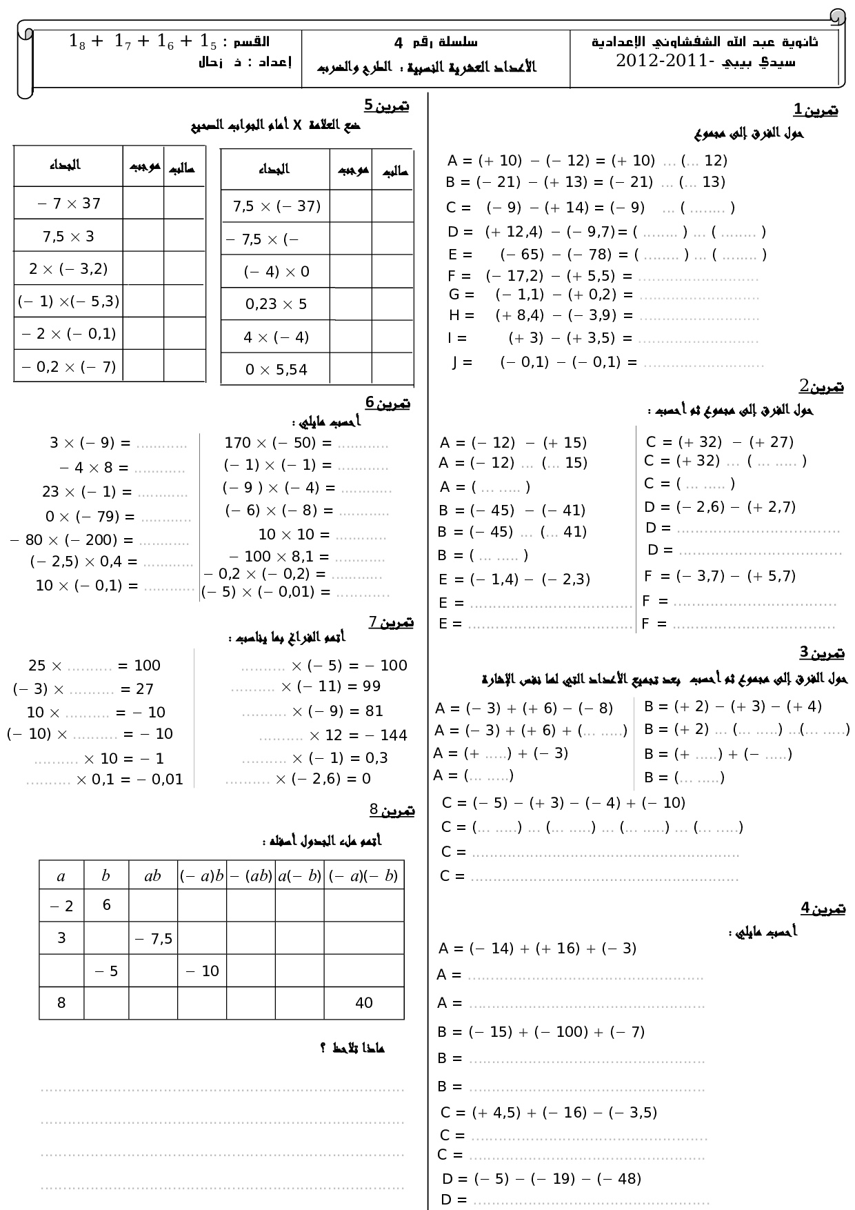ضرب وقسمة الأعداد العشرية النسبية - تمارين غير محلولة 3