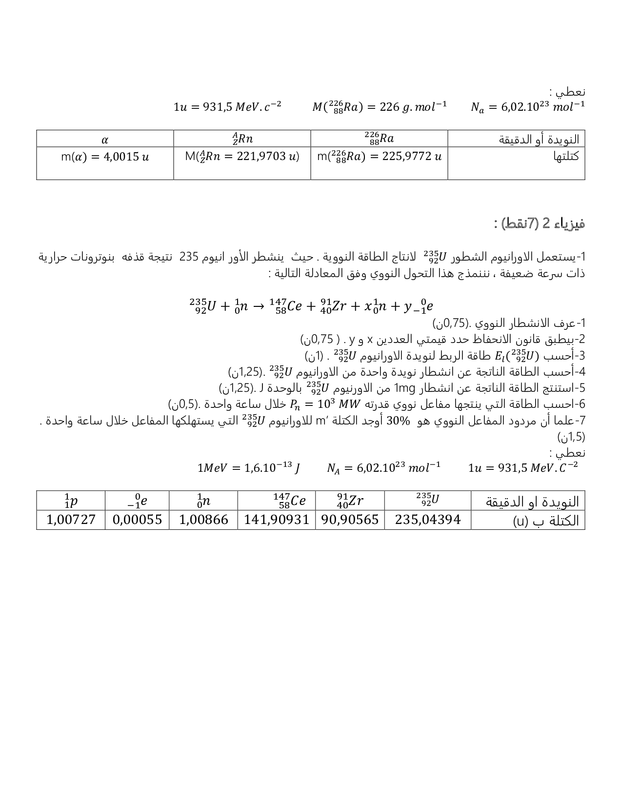 الفرض 2 نموذج 2 - الفيزياء والكيمياء ثانية باك علوم فيزيائية الدورة الأولى