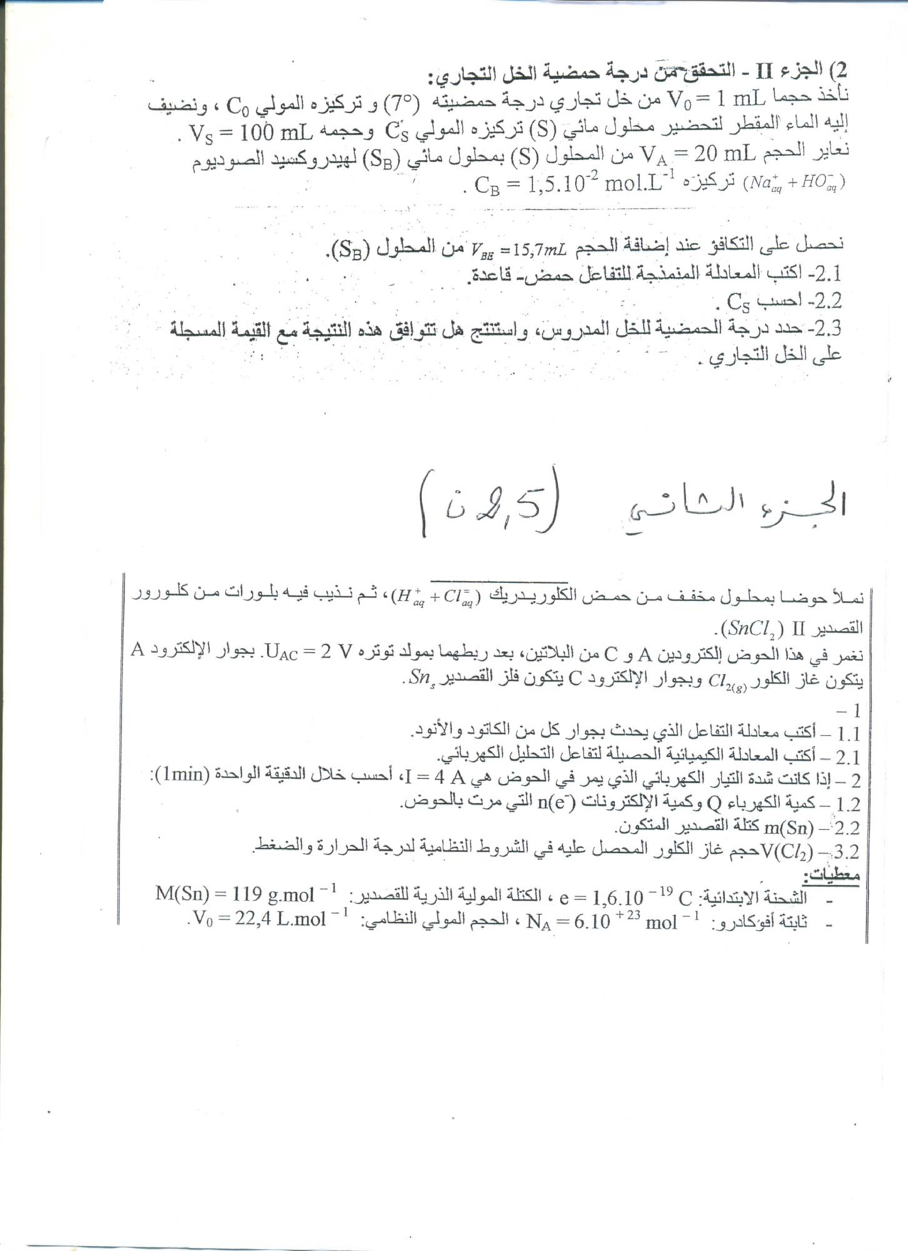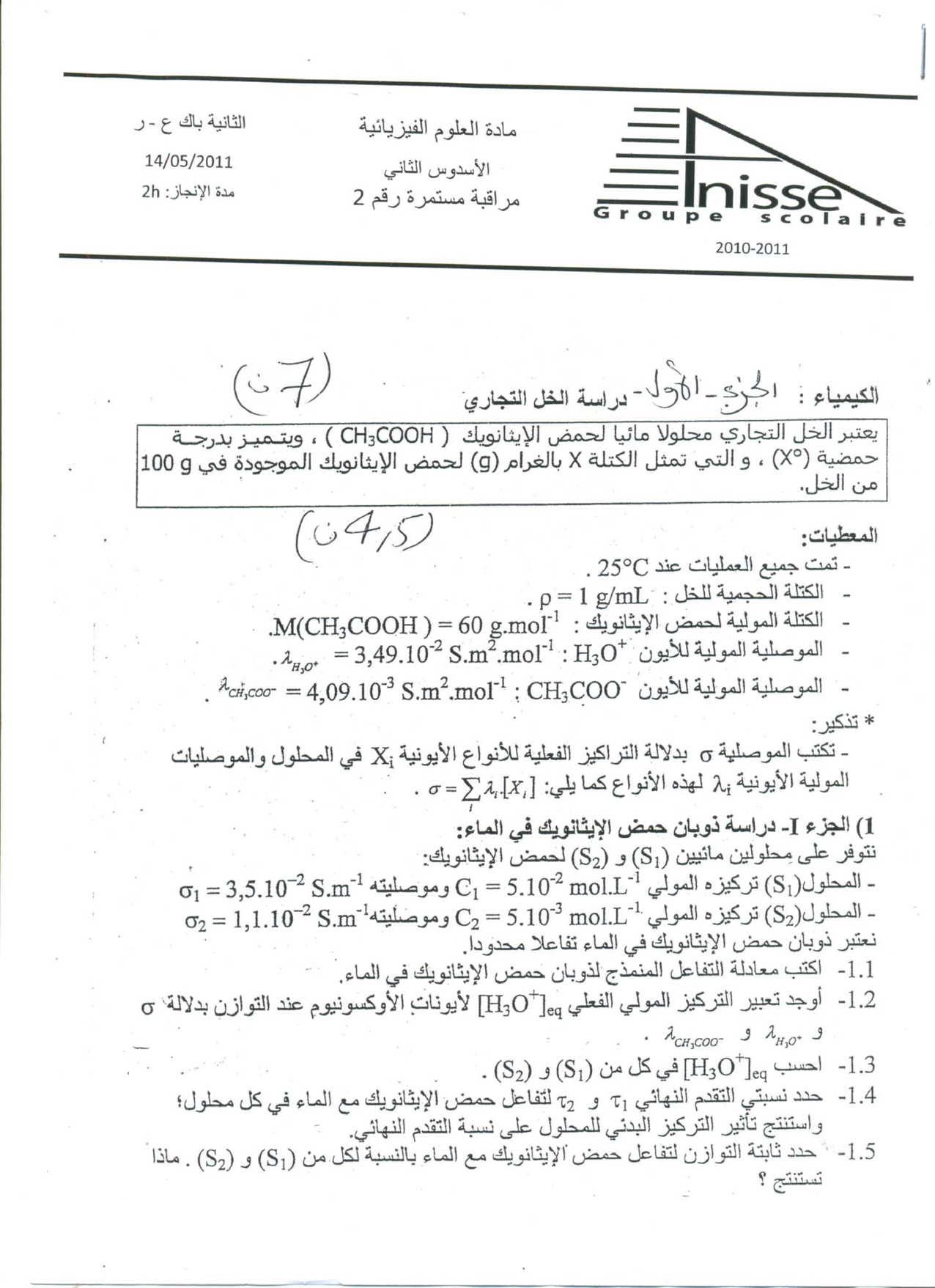 الفرض 3 نموذج 5 - الفيزياء والكيمياء ثانية باك علوم رياضية الدورة الثانية