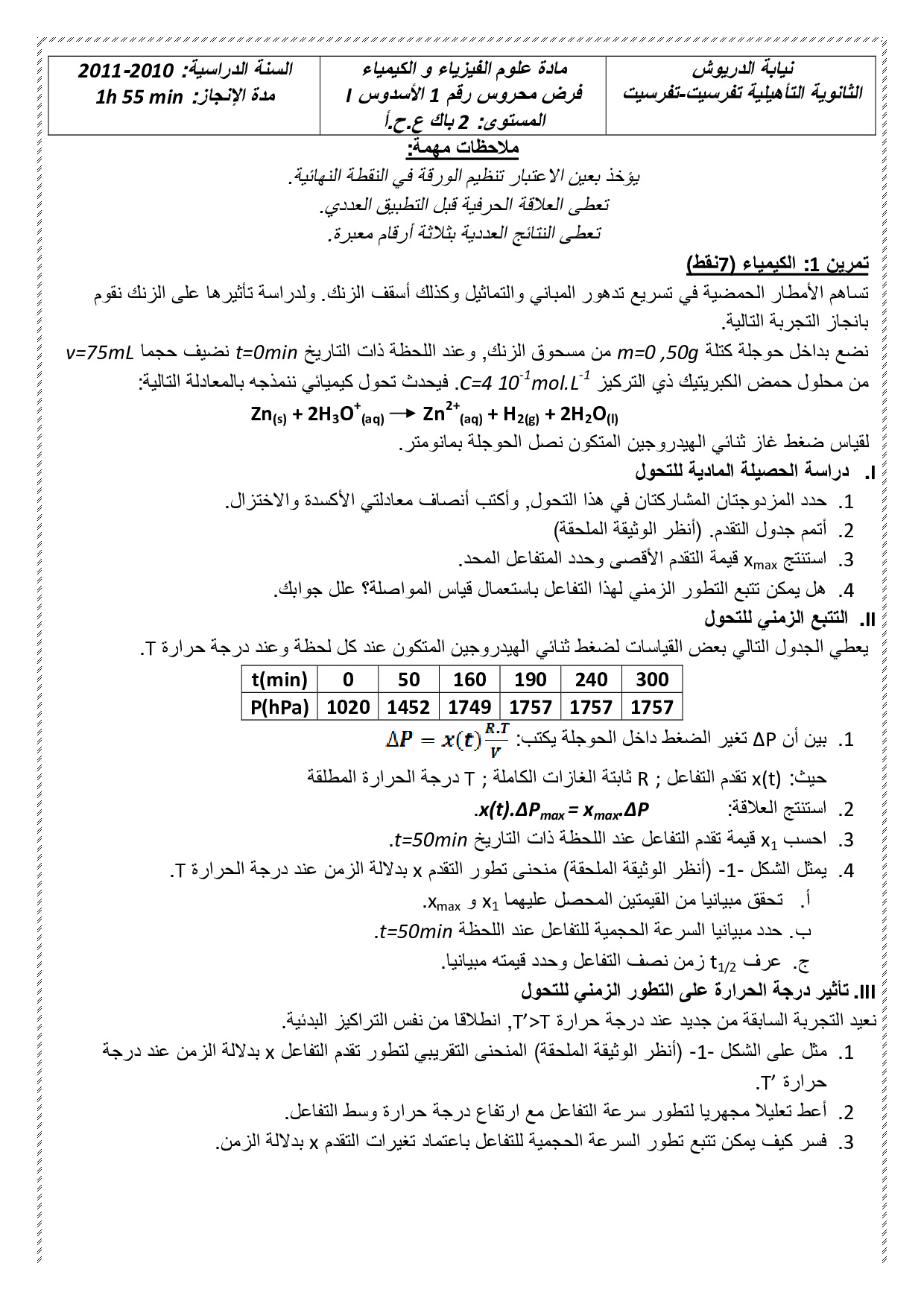 الفرض 1 نموذج 10 - الفيزياء والكيمياء ثانية باك علوم الحياة والأرض الدورة الأولى