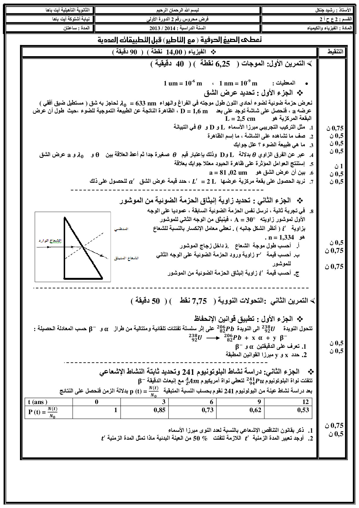 الفرض 2 نموذج 5 - الفيزياء والكيمياء ثانية باك علوم الحياة والأرض الدورة الأولى