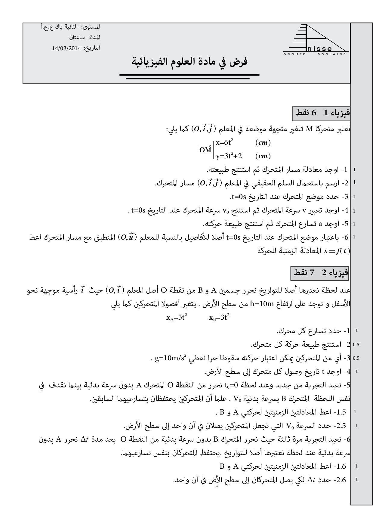 الفرض 1 نموذج 14 - الفيزياء والكيمياء ثانية باك علوم الحياة والأرض الدورة الثانية