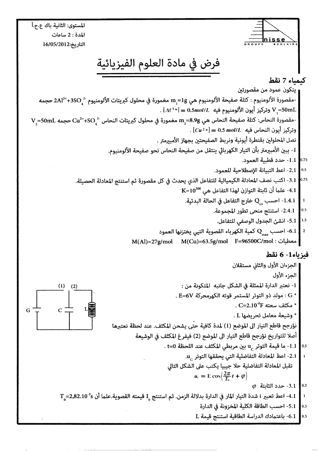 الفرض 2 نموذج 11 - الفيزياء والكيمياء ثانية باك علوم الحياة والأرض الدورة الثانية