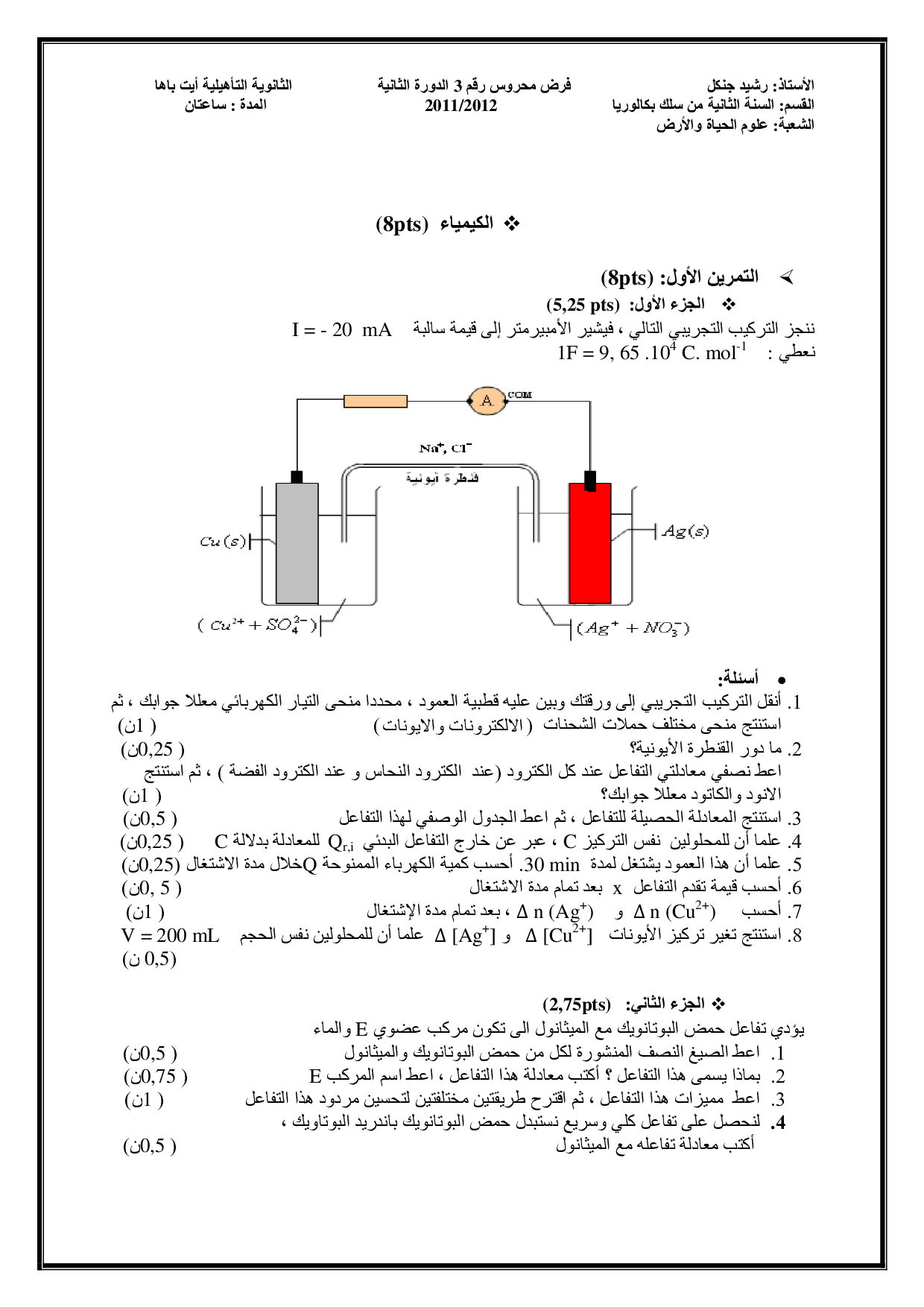 الفرض 3 نموذج 4 - الفيزياء والكيمياء ثانية باك علوم الحياة والأرض الدورة الثانية