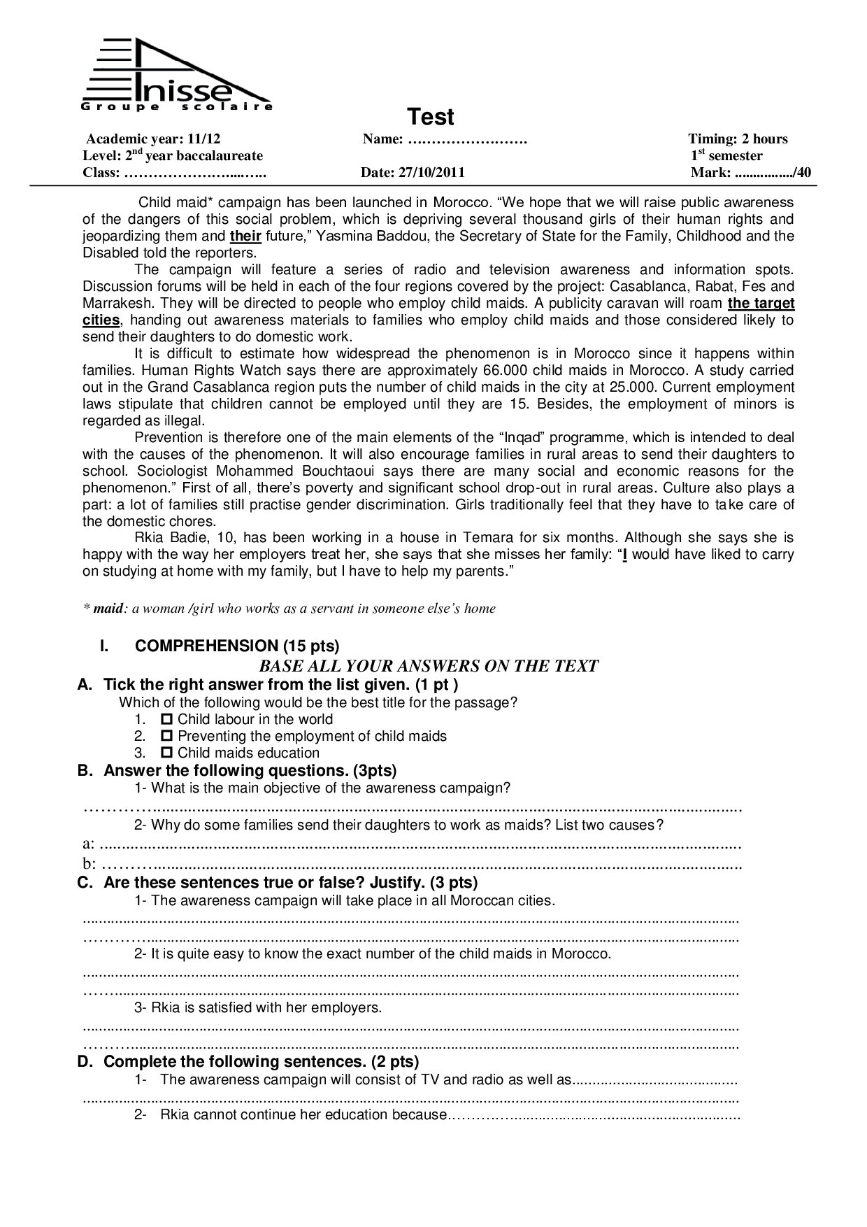 Test 1 Model 9 - English 2 Bac First term