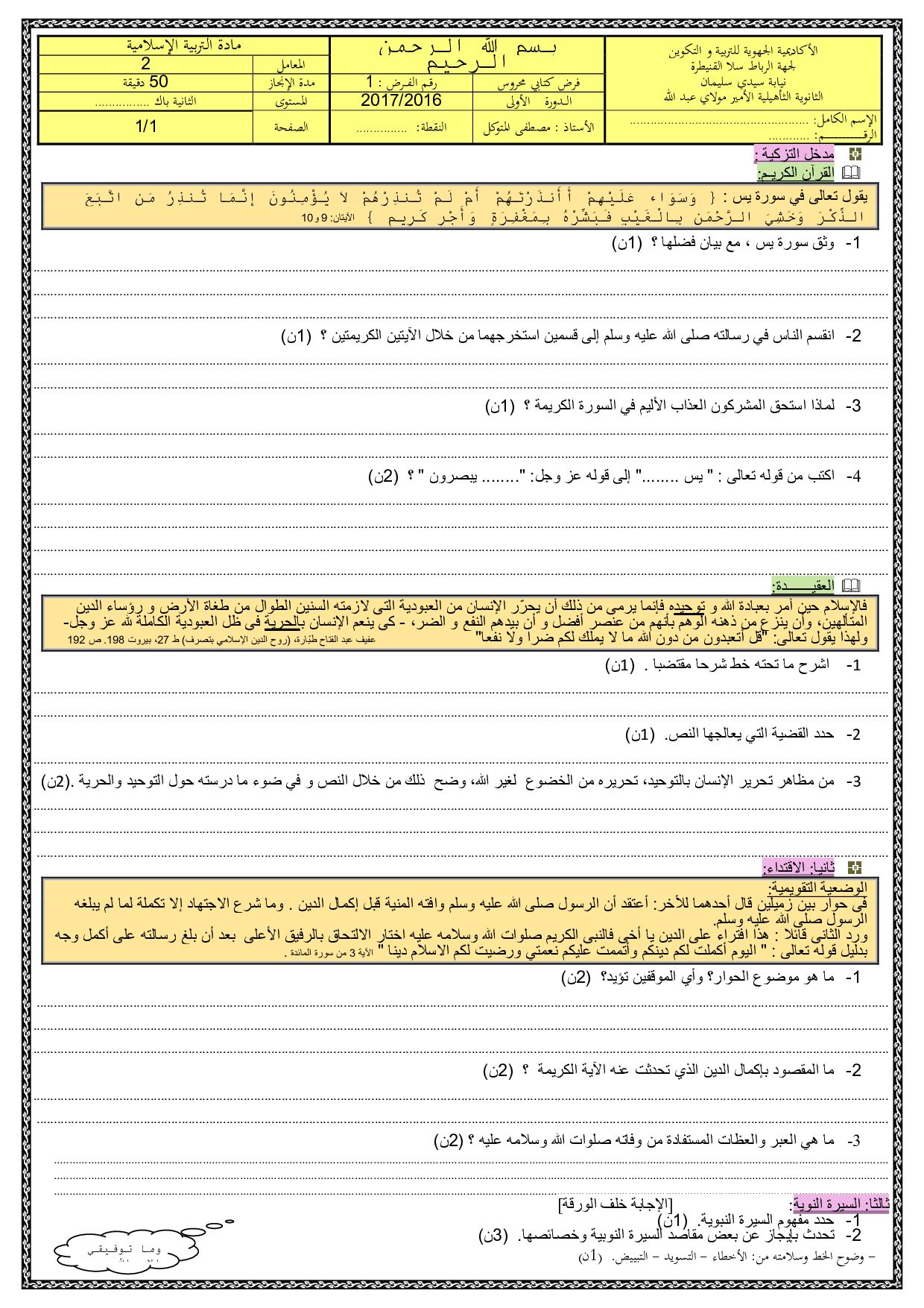 الفرض 1 نموذج 2 - التربية الإسلامية ثانية باك الدورة الأولى