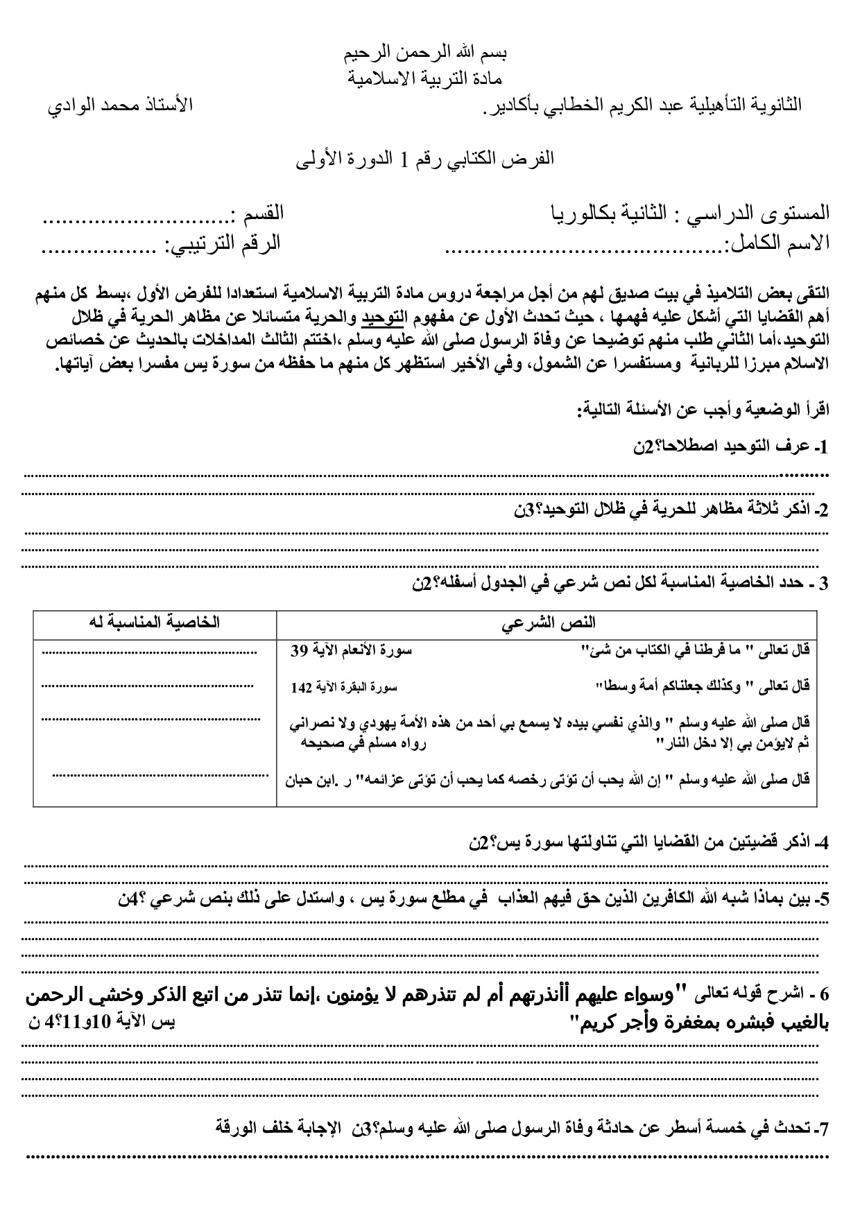 الفرض 1 نموذج 5 - التربية الإسلامية ثانية باك الدورة الأولى