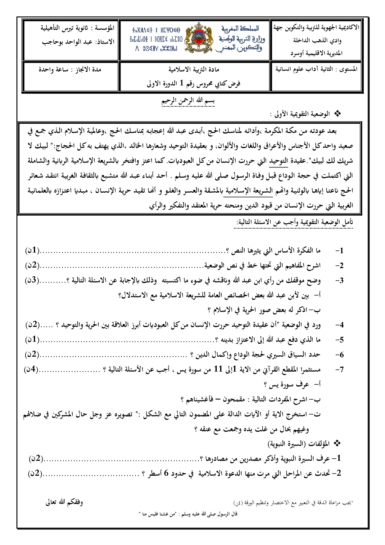 الفرض 1 نموذج 7 - التربية الإسلامية ثانية باك الدورة الأولى