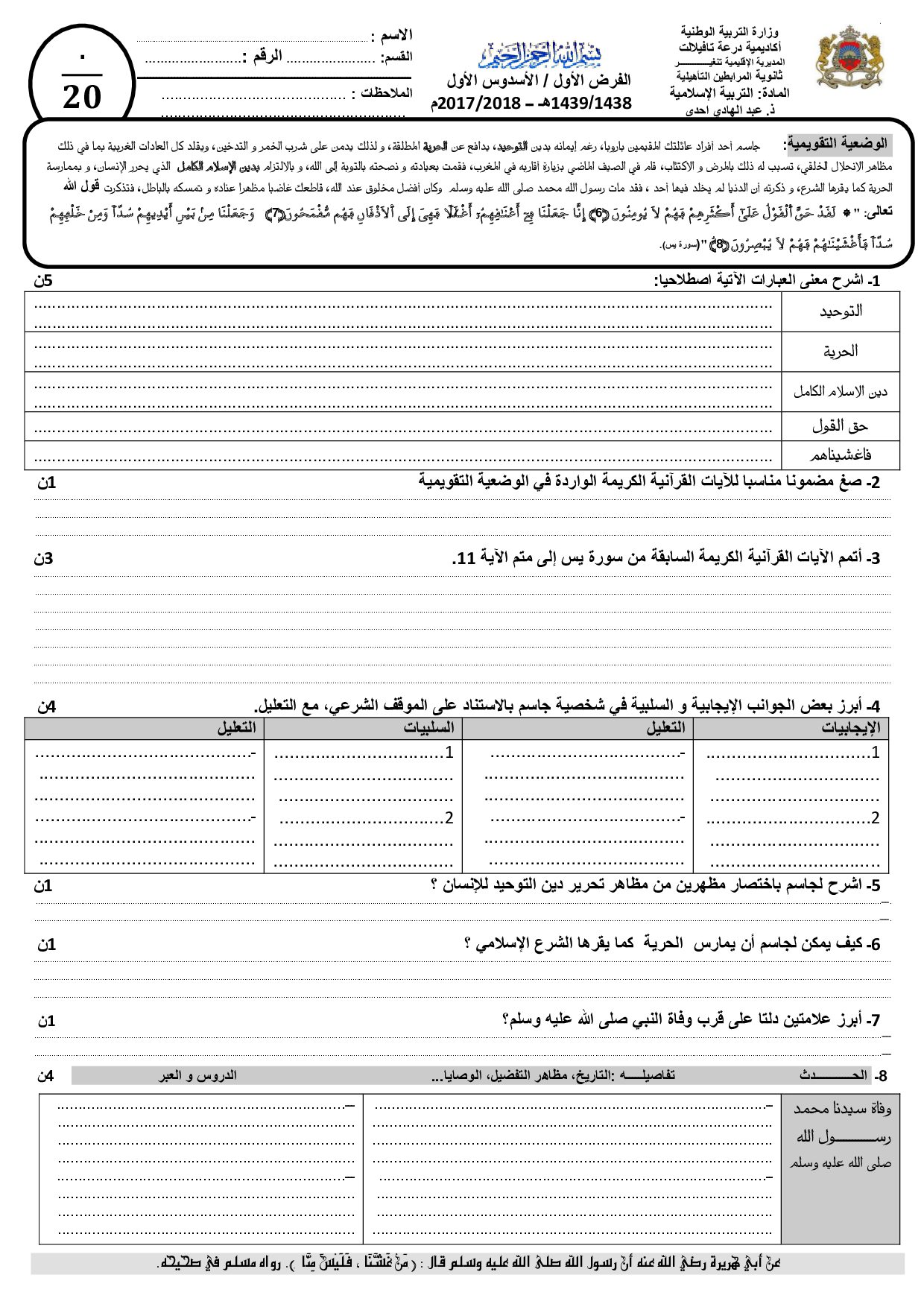 الفرض 1 نموذج 10 - التربية الإسلامية ثانية باك الدورة الأولى
