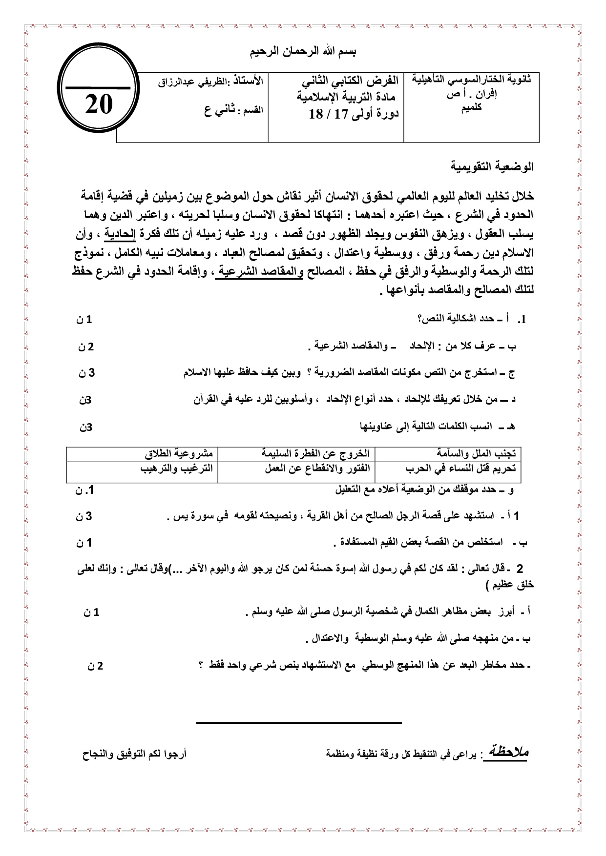 الفرض 2 نموذج 6 - التربية الإسلامية ثانية باك الدورة الأولى
