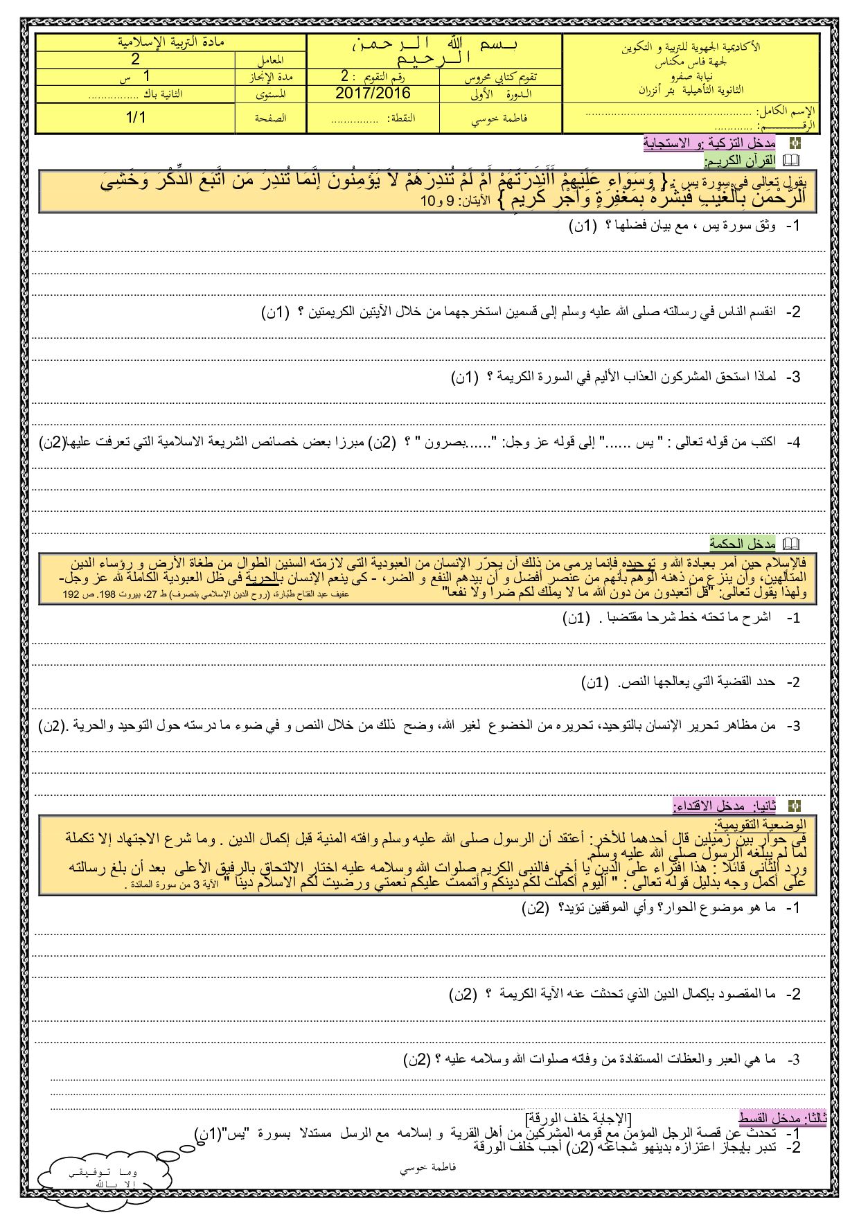 التربية الإسلامية: الثانية باك علوم رياضية أ