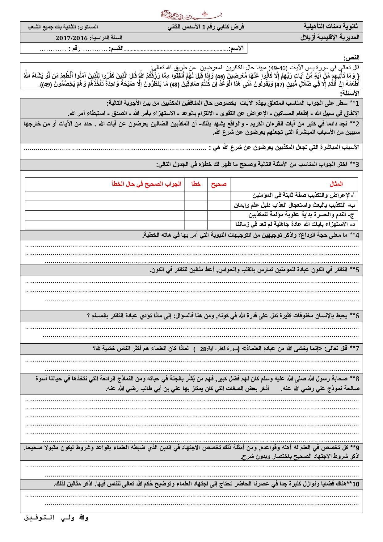 الفرض 1 نموذج 1 - التربية الإسلامية ثانية باك الدورة الثانية