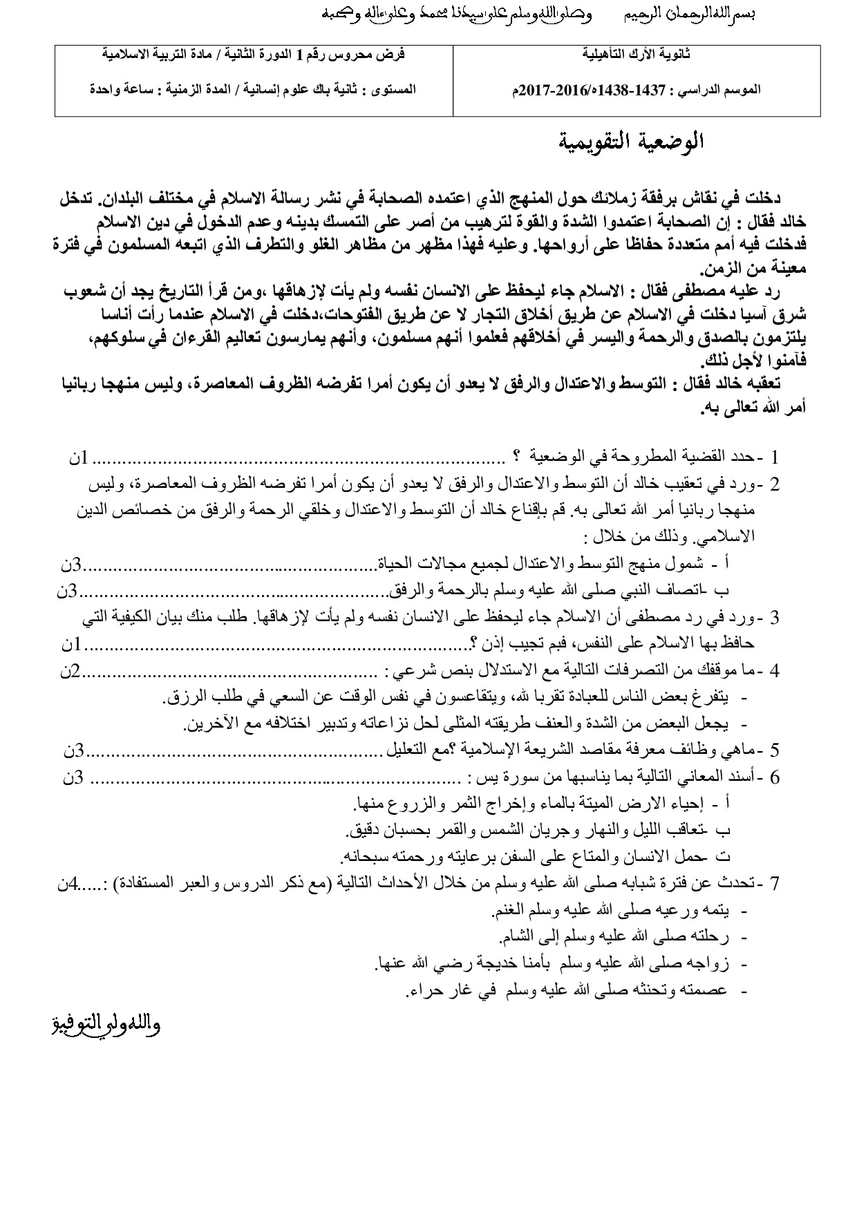 التربية الإسلامية: الثانية باك علوم رياضية أ