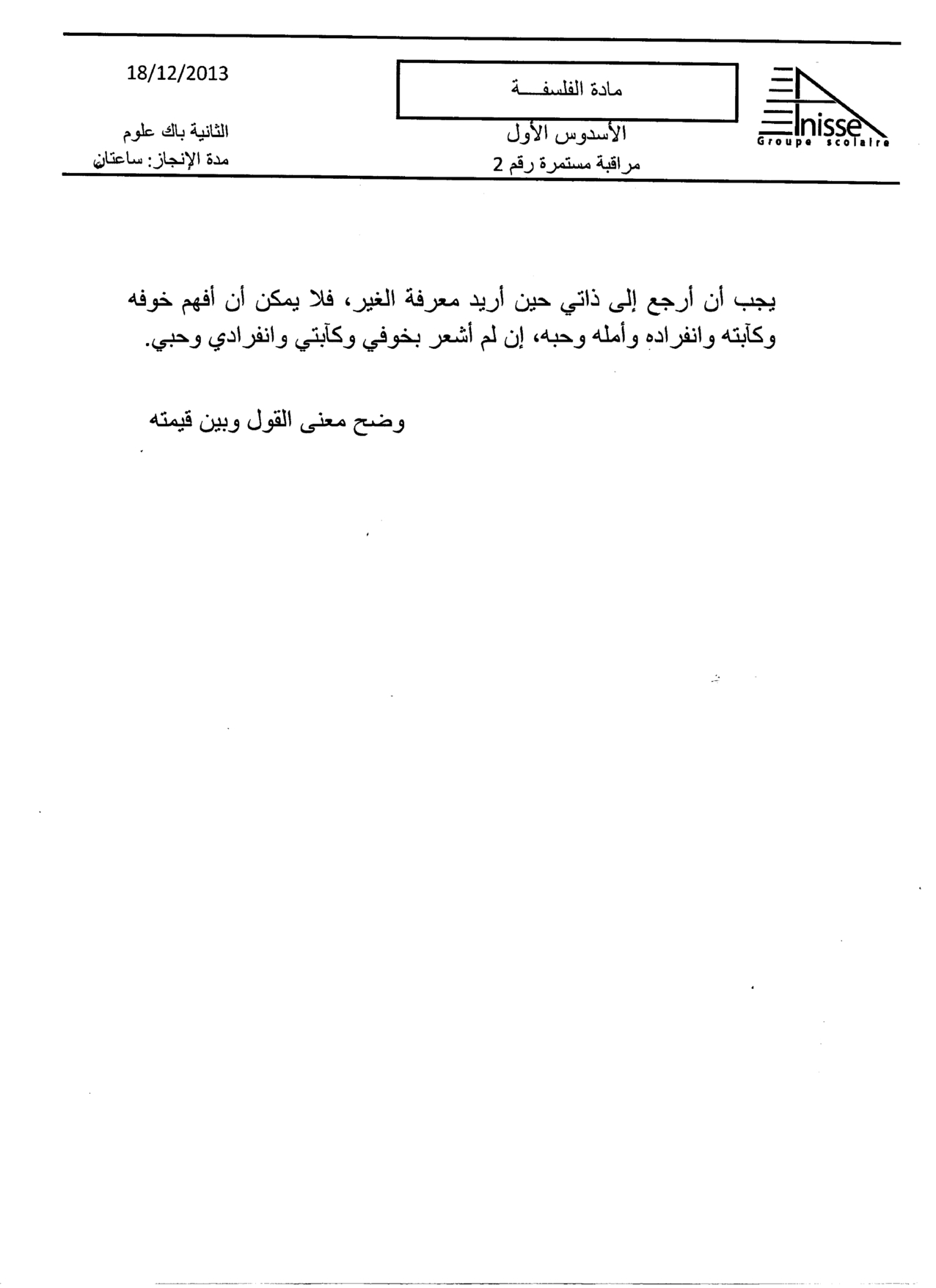 الفرض 2 نموذج 7 - الفلسفة ثانية باك علوم وتقنيات الدورة الأولى