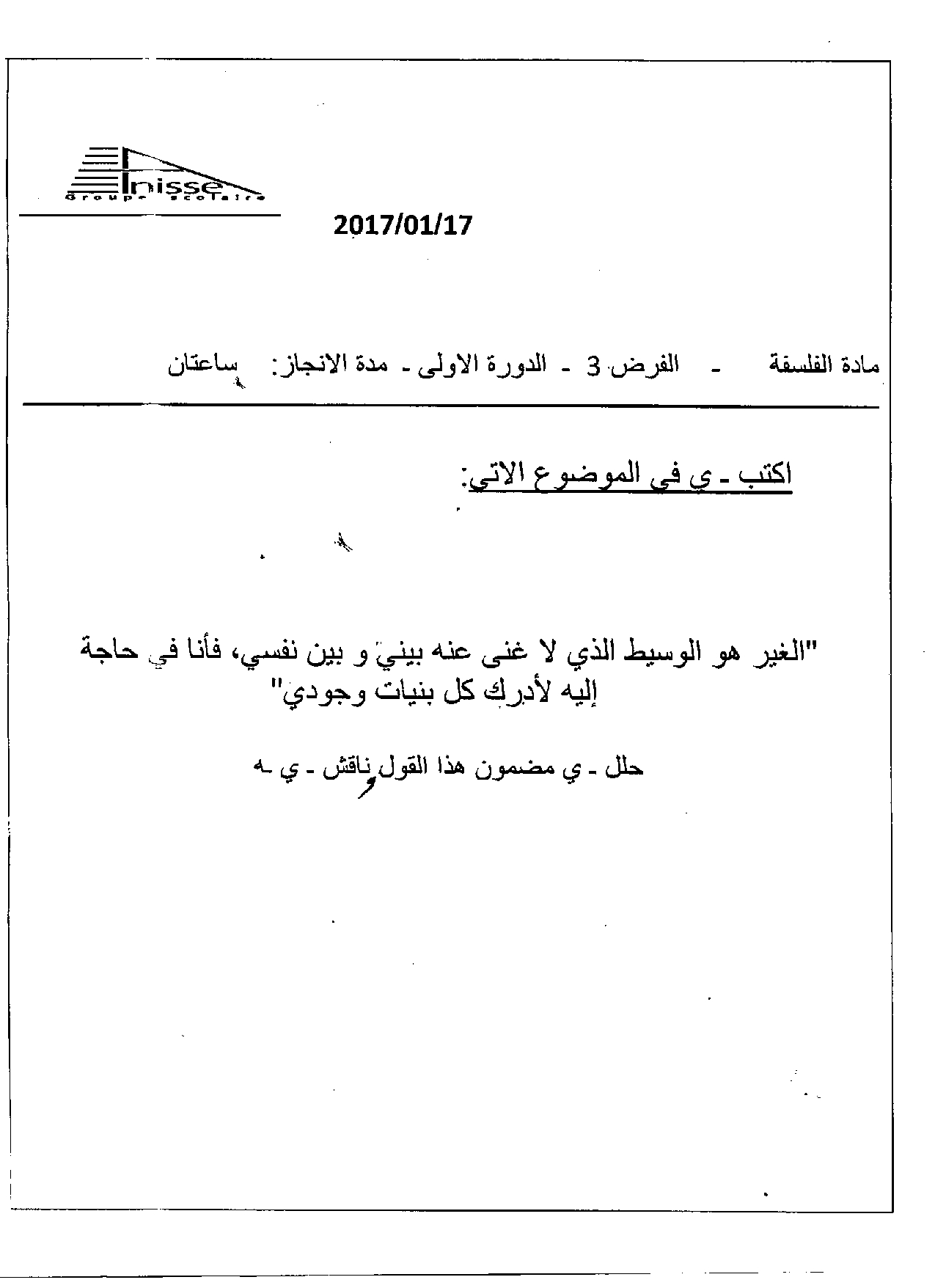 الفرض 3 نموذج 3 - الفلسفة ثانية باك علوم وتقنيات الدورة الأولى