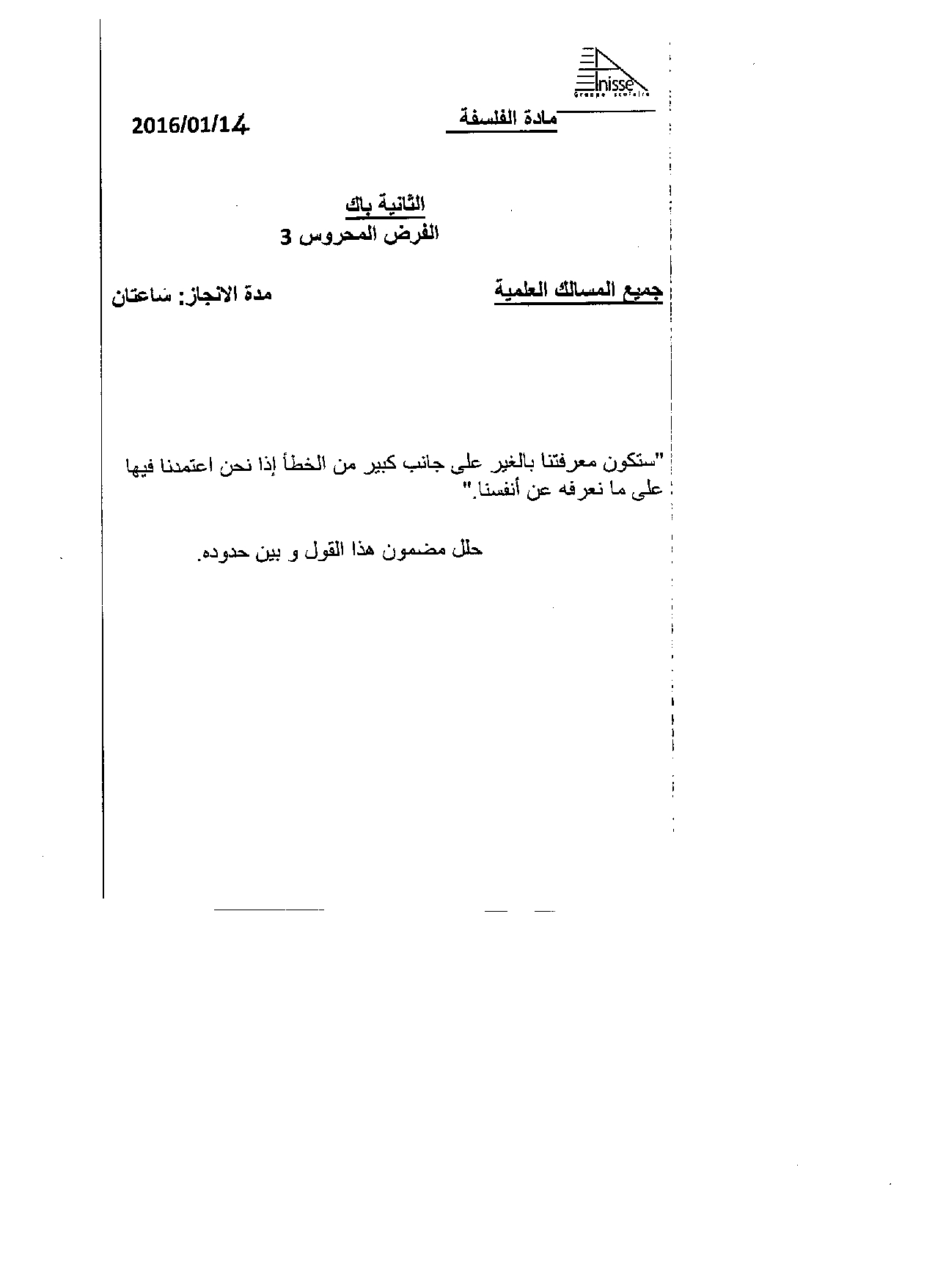 الفرض 3 نموذج 4 - الفلسفة ثانية باك علوم وتقنيات الدورة الأولى