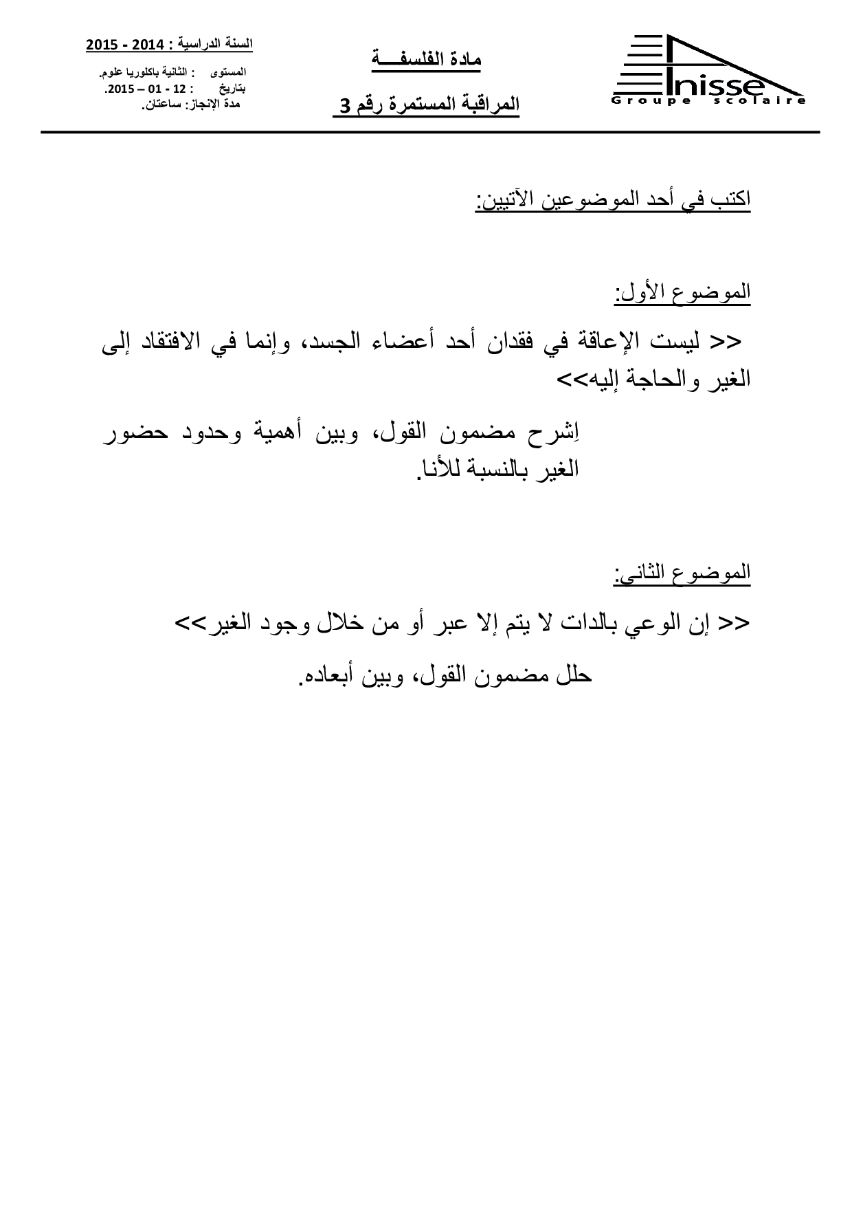 الفرض 3 نموذج 5 - الفلسفة ثانية باك علوم وتقنيات الدورة الأولى