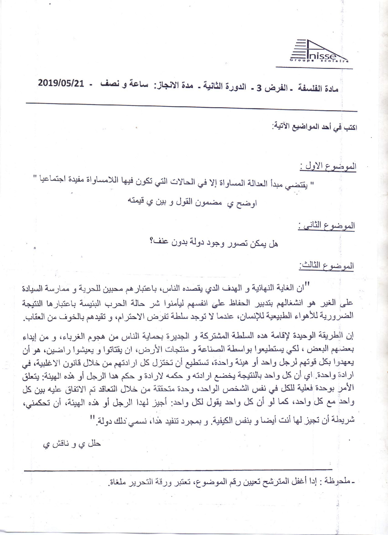 الفرض 3 نموذج 1 - الفلسفة ثانية باك علوم وتقنيات الدورة الثانية