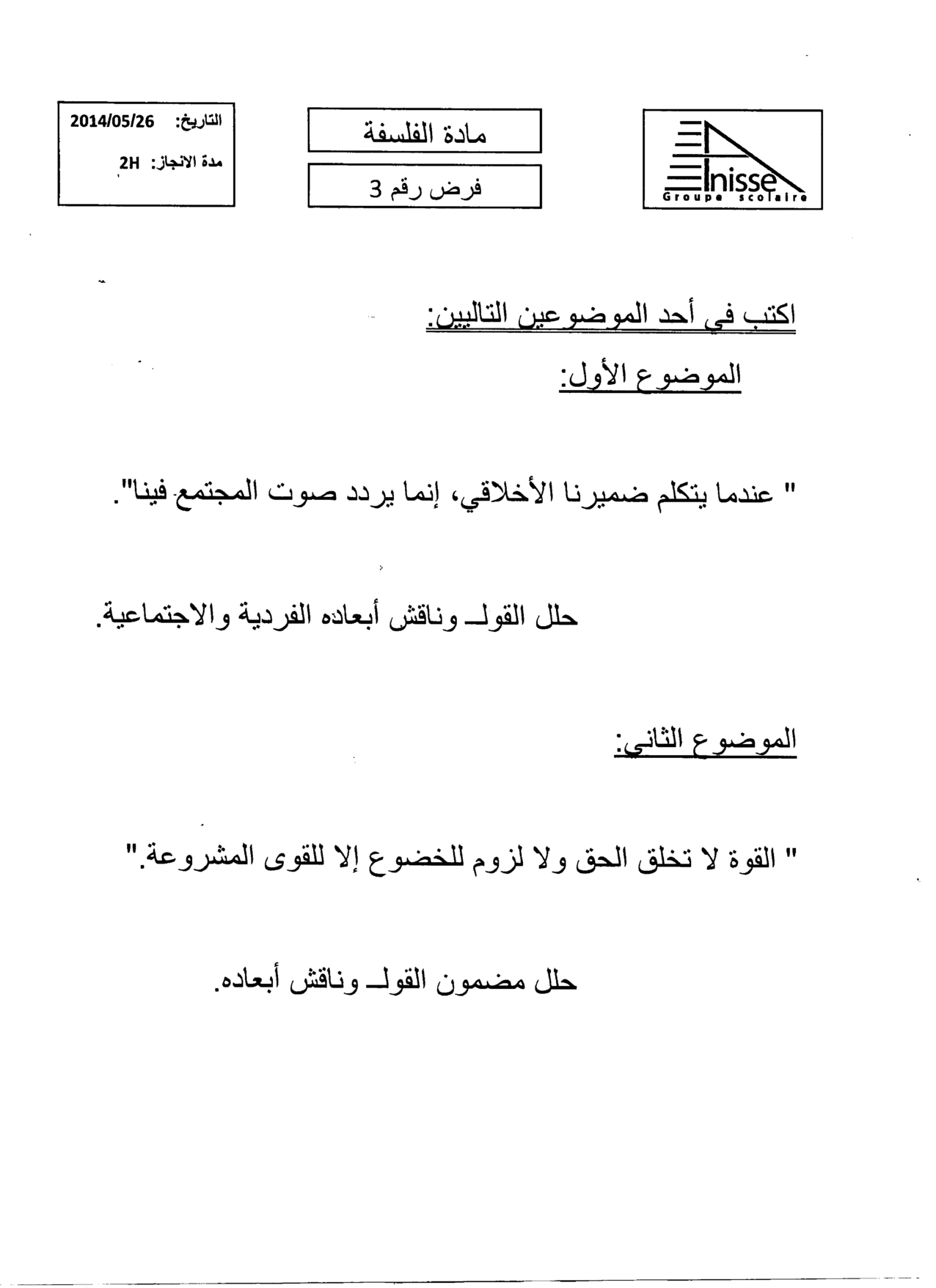 الفرض 3 نموذج 5 - الفلسفة ثانية باك علوم وتقنيات الدورة الثانية