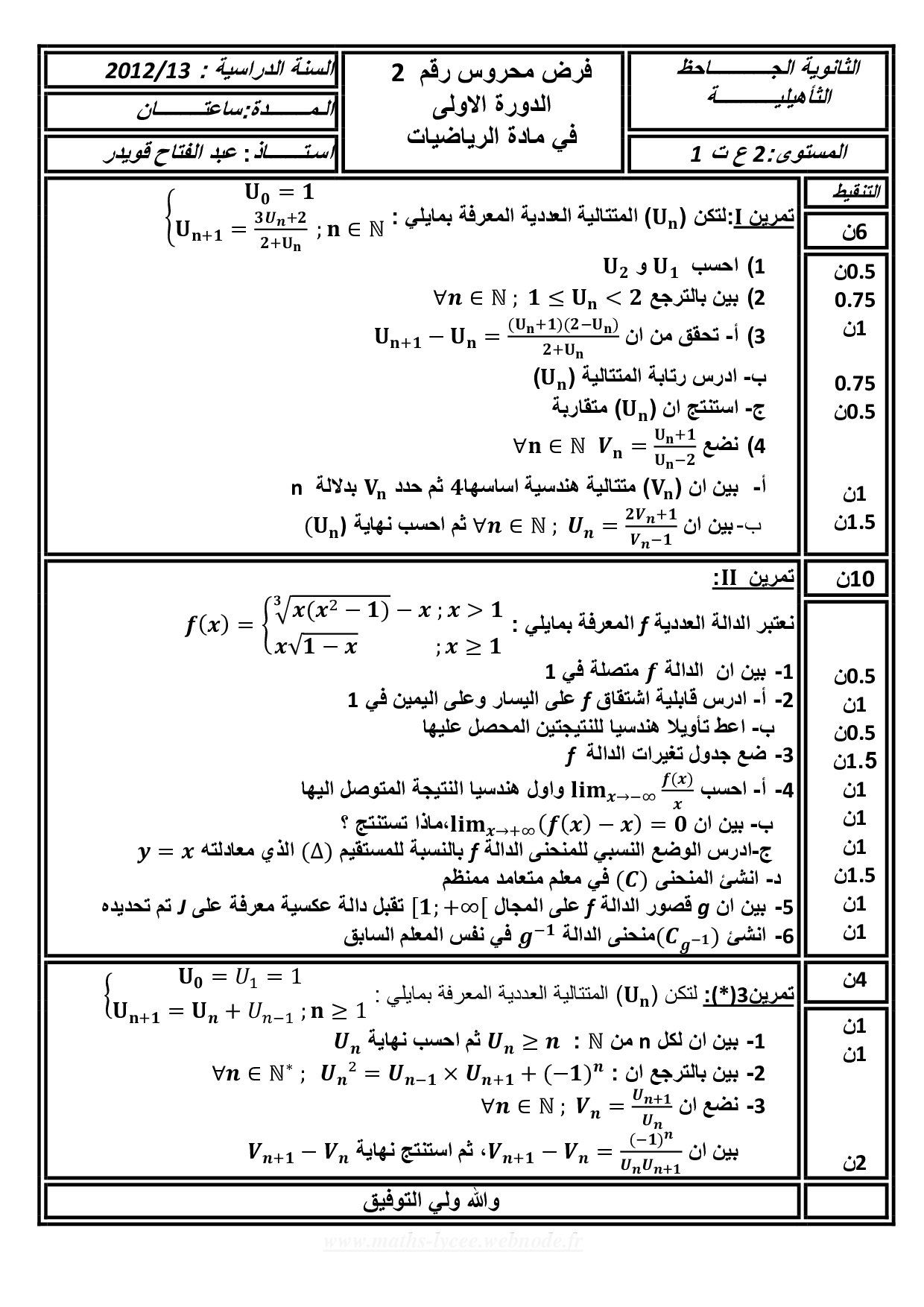 الفرض 2 نموذج 1 - الرياضيات ثانية باك علوم وتقنيات الدورة الأولى