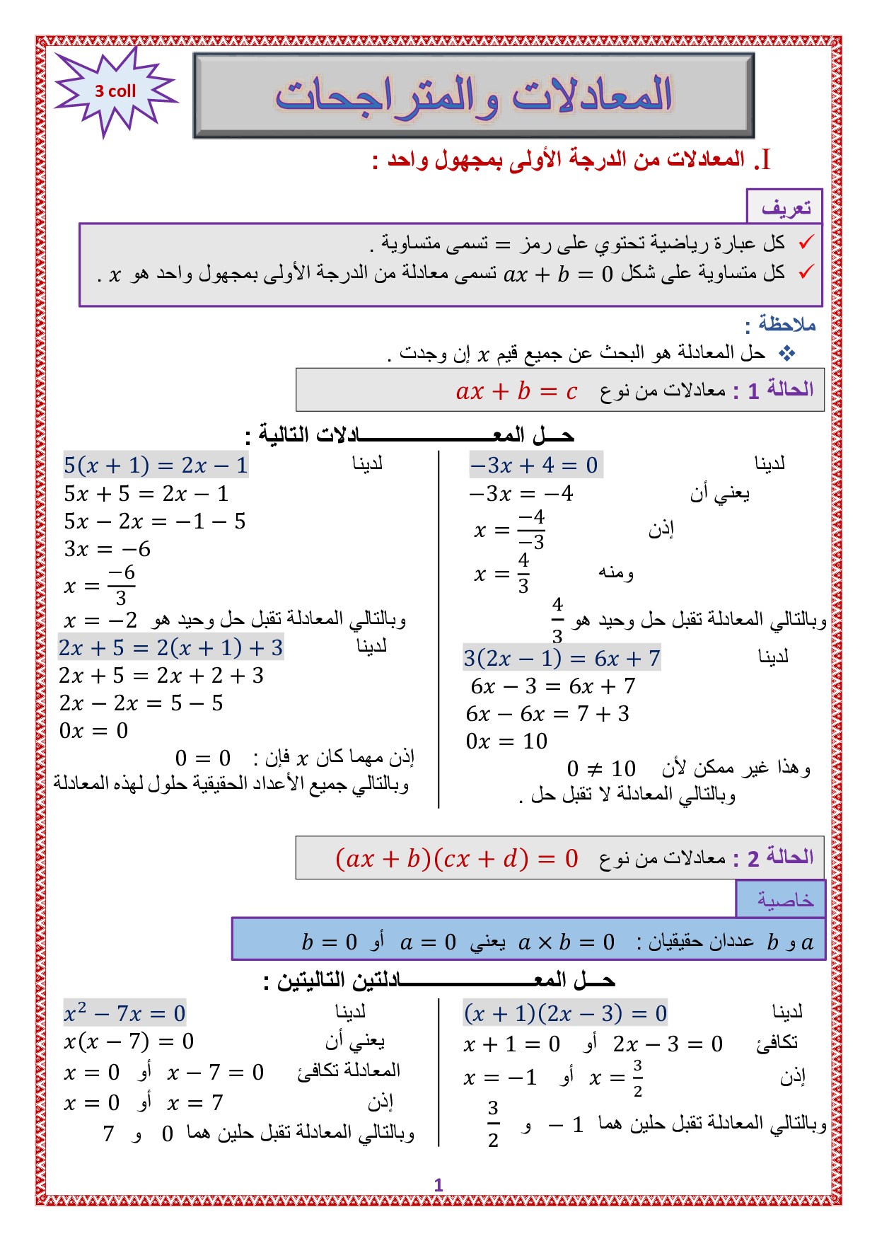 المعادلات والمتراجحات من الدرجة الأولى بمجهول واحد - الدرس 1