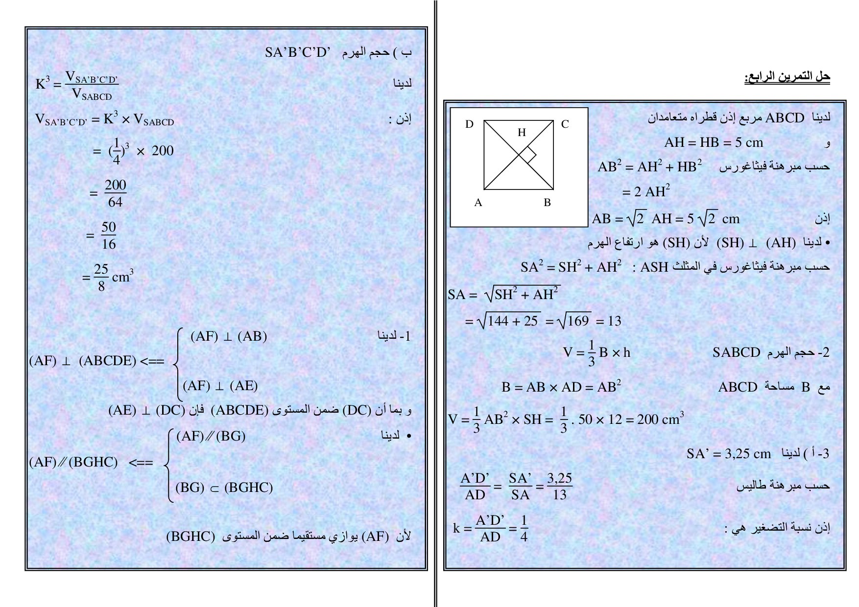 الهندسة الفضائية (حساب الحجوم والمساحات والتكبير والتصغير) - تصحيح سلسلة التمارين 4