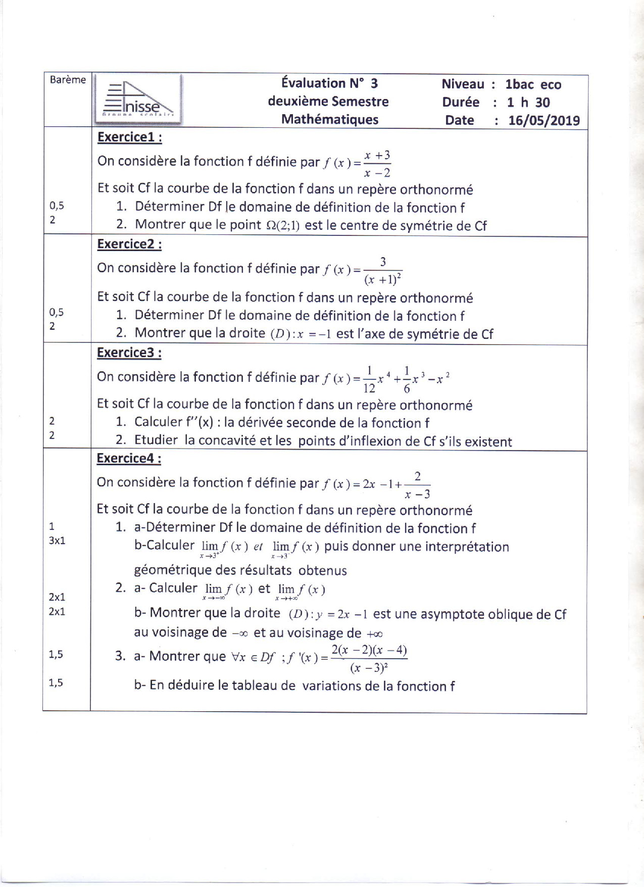 الفرض 3 نموذج 1 - الرياضيات أولى باك علوم إقتصادية الدورة الثانية