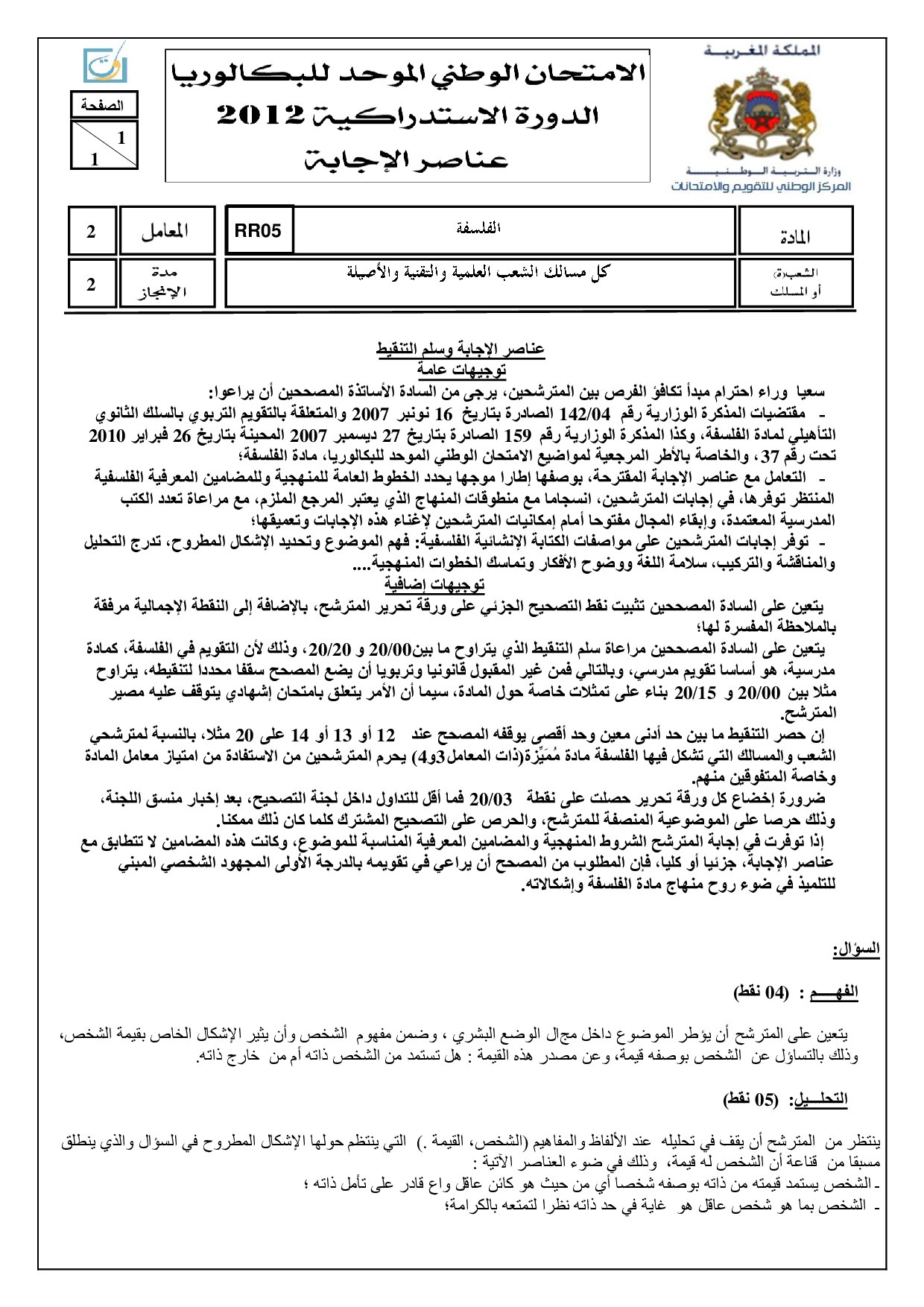 الفلسفة للشعب العلمية والتقنية 2012 الدورة الإستدراكية - التصحيح