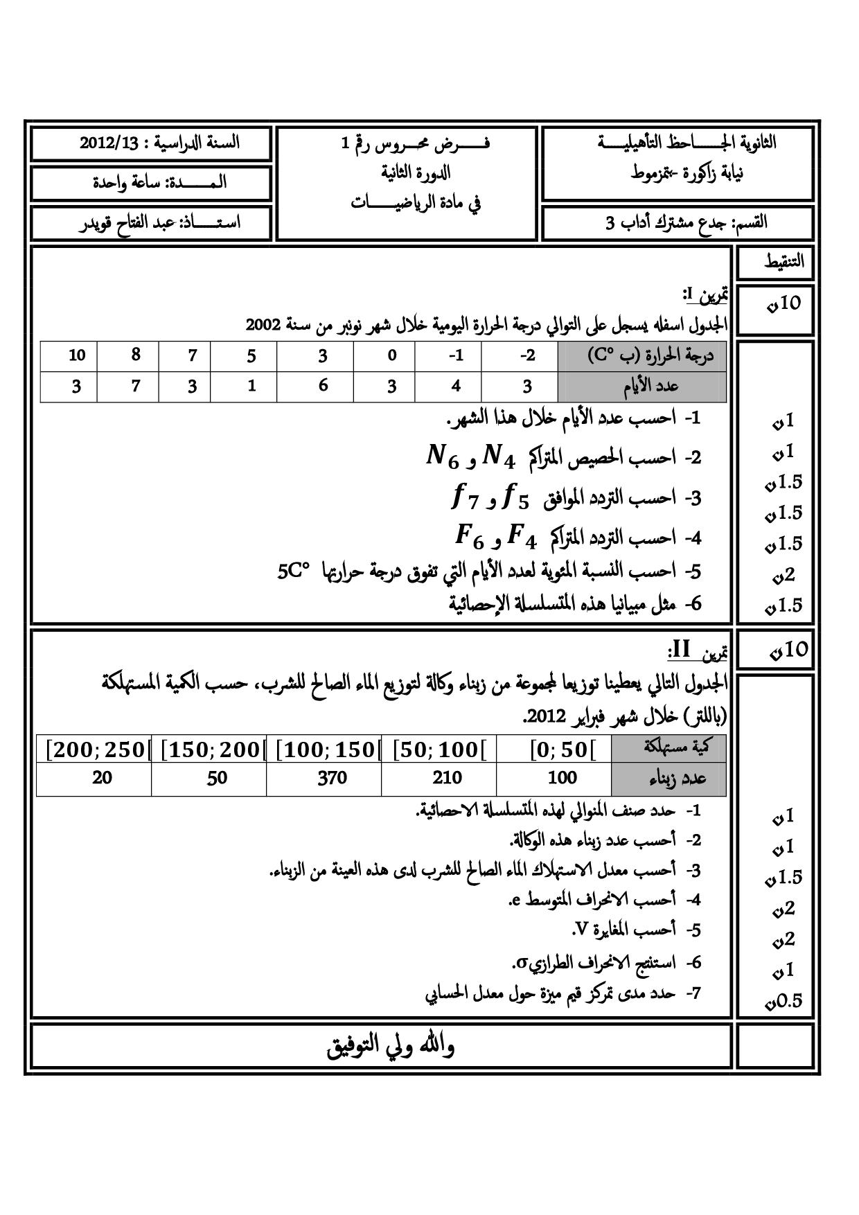 الفرض 1 نموذج 4 - الرياضيات جذع مشترك آداب وعلوم إنسانية الدورة الثانية