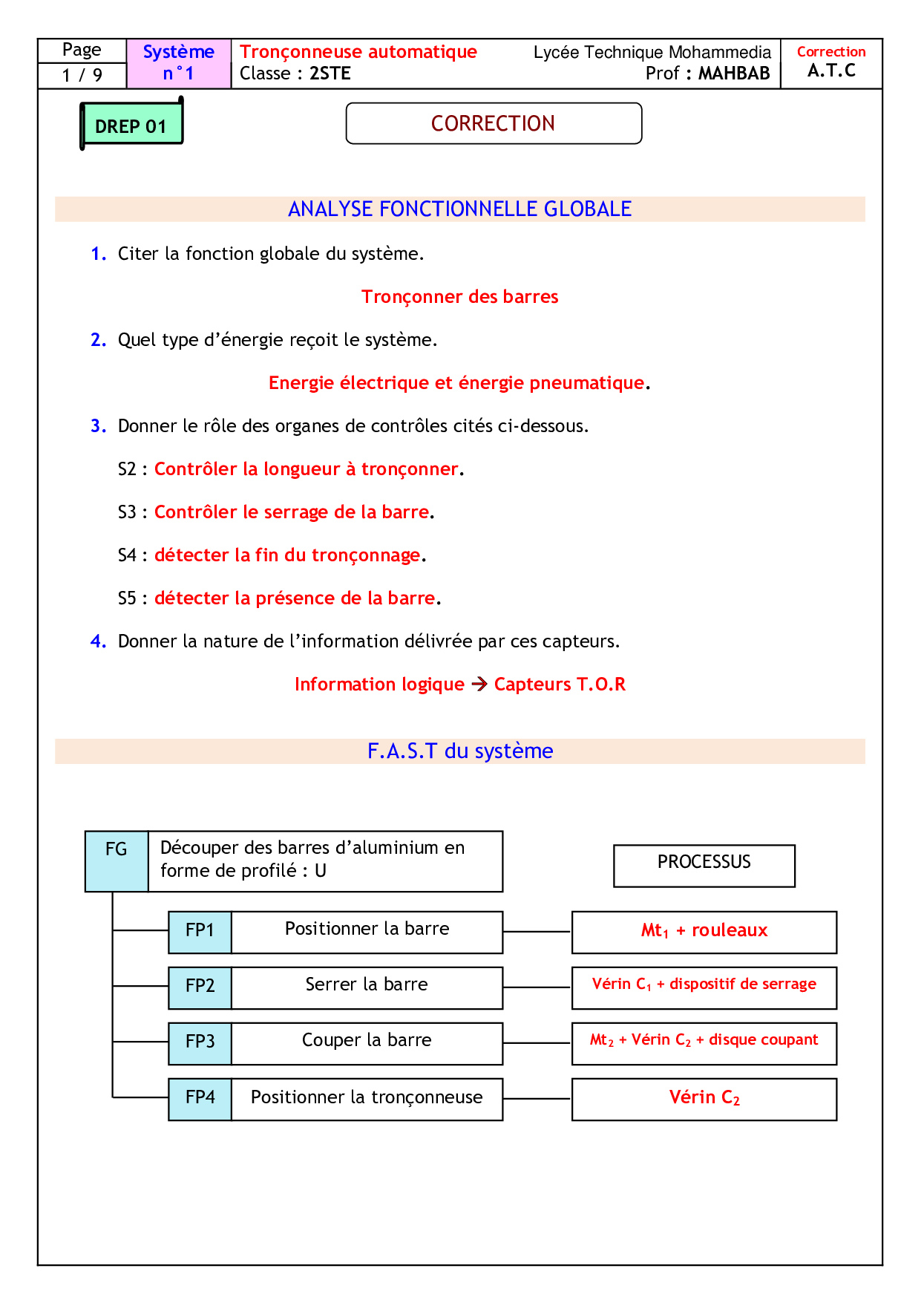 1- Tronçonneuse automatique - Grafcet, Organigramme, Système minimum : Corrigé