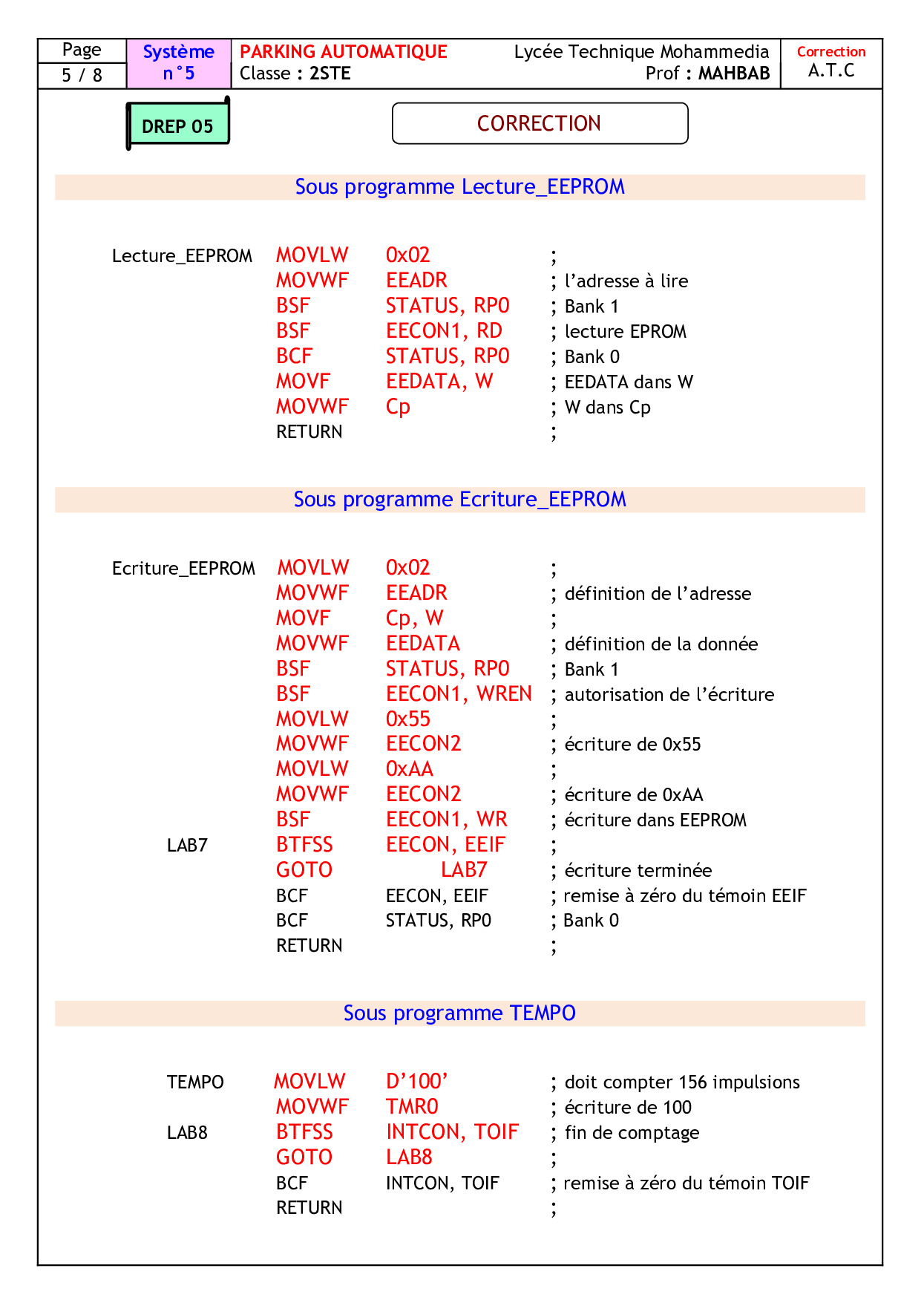 5- Parking Automatique - Grafcet, EEPROM du 16F84, Interruptions du 16F84, Programmation du P.L.D : Corrigé