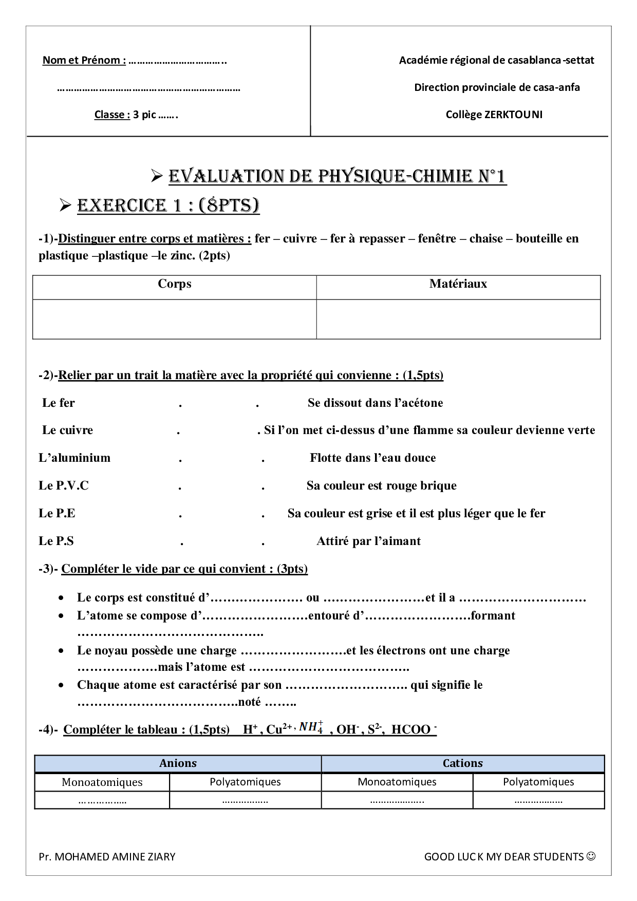 Devoir 1 Modèle 1 - Physique-Chimie 3AC Semestre 1