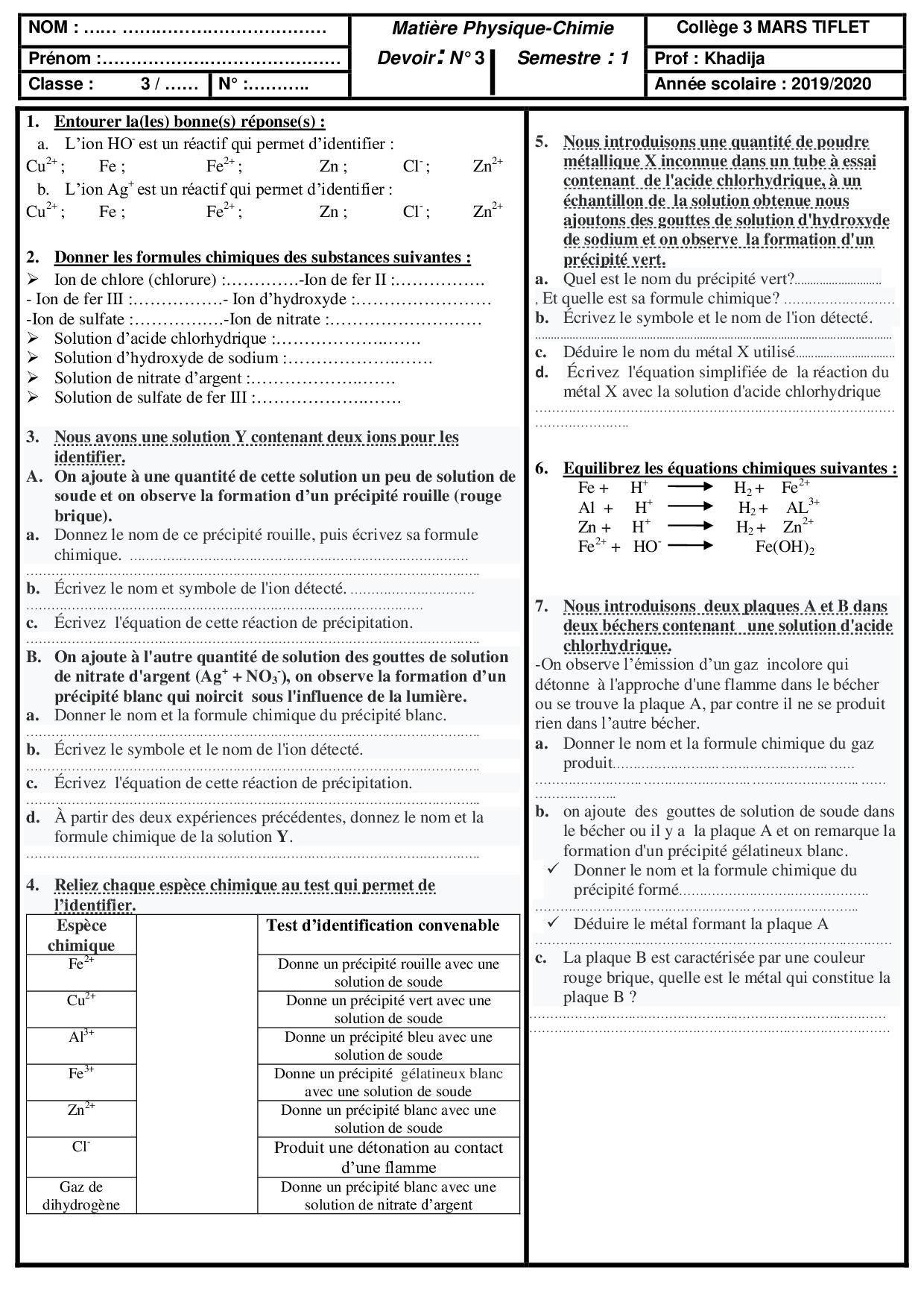 Devoir 3 Modèle 8 - Physique-Chimie 3AC Semestre 1