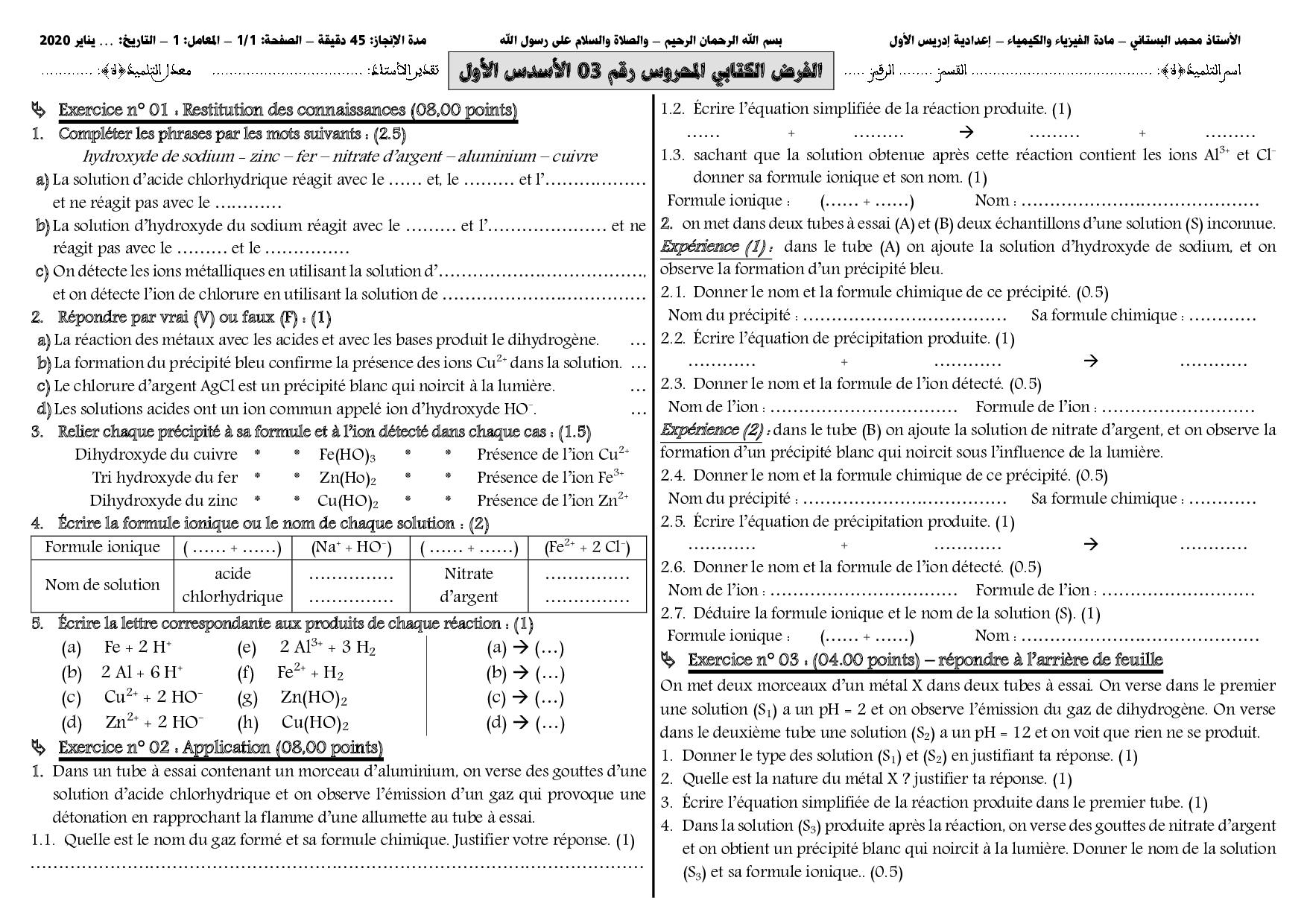 Devoir 3 Modèle 10 - Physique-Chimie 3AC Semestre 1