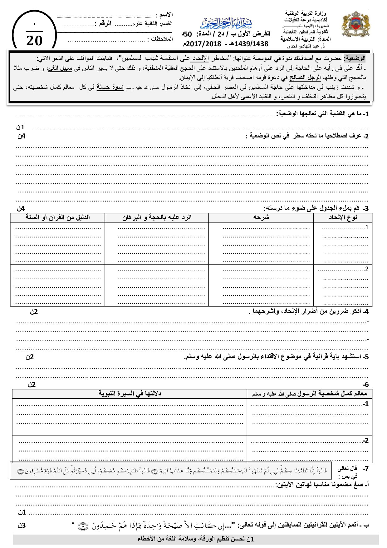 الفرض 1 نموذج 7 - التربية الإسلامية ثانية باك الدورة الثانية