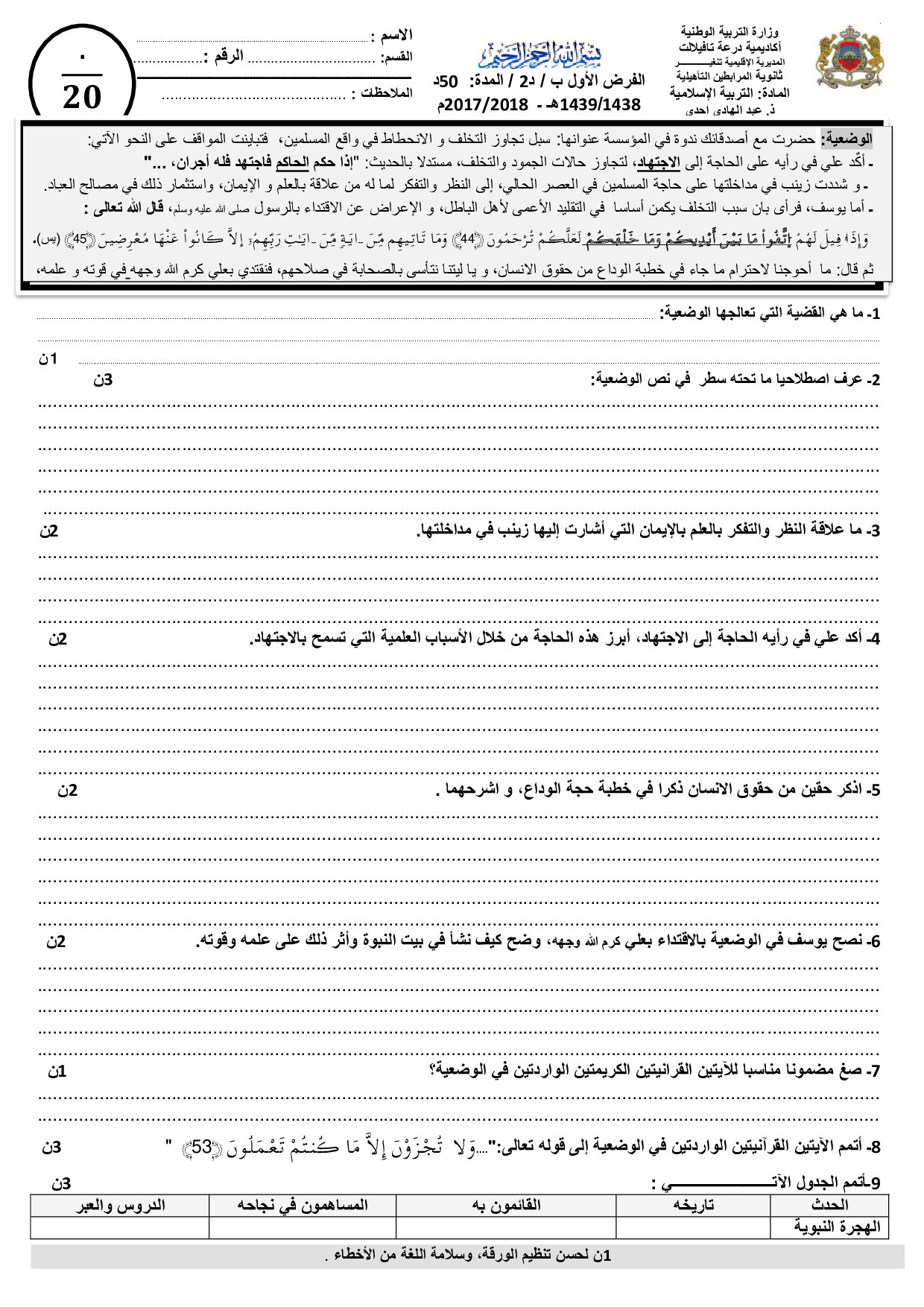التربية الإسلامية: الثانية باك علوم رياضية أ